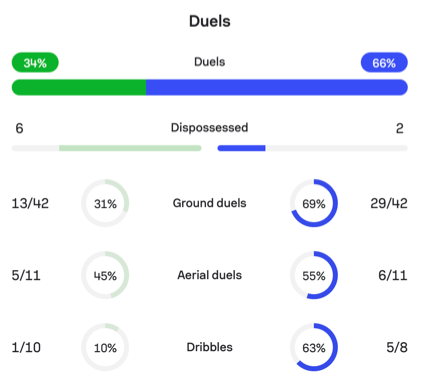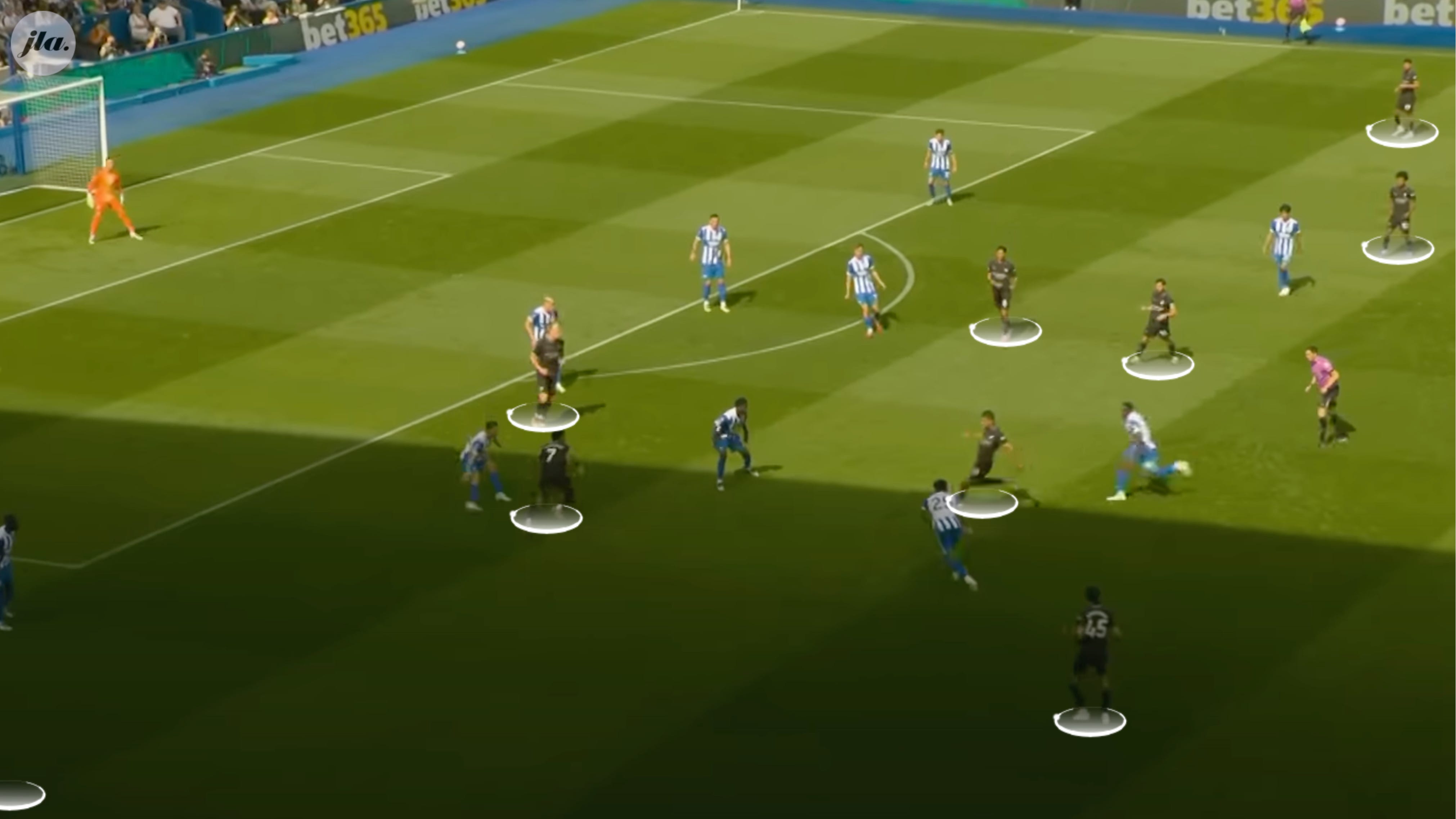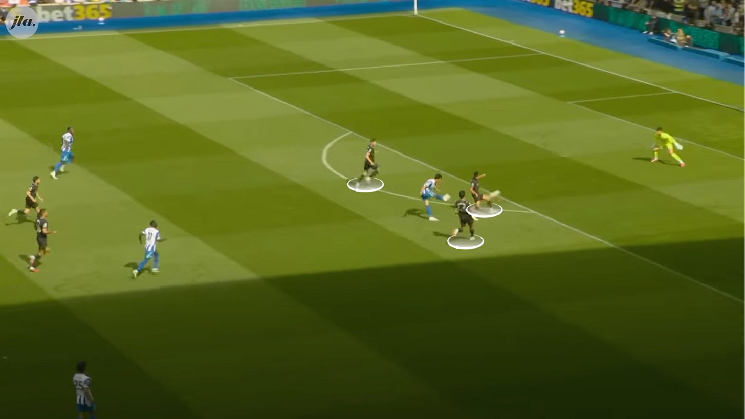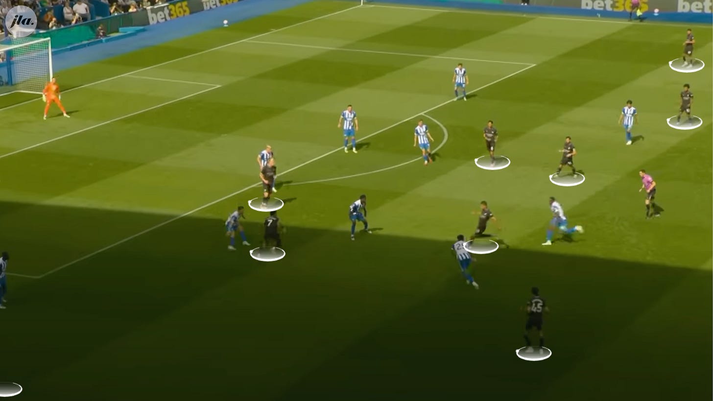 Brighton were happy to allow Man City to camp in their half in their 2-1 win, encouraging them to commit more bodies forward, and leaving bigger gaps between their central defenders. When the opportunity arose after winning the ball back, they would break and make their way to the other end. They matched Man City’s and had higher expected goals (2.30-1.82) despite only having 36% possession.