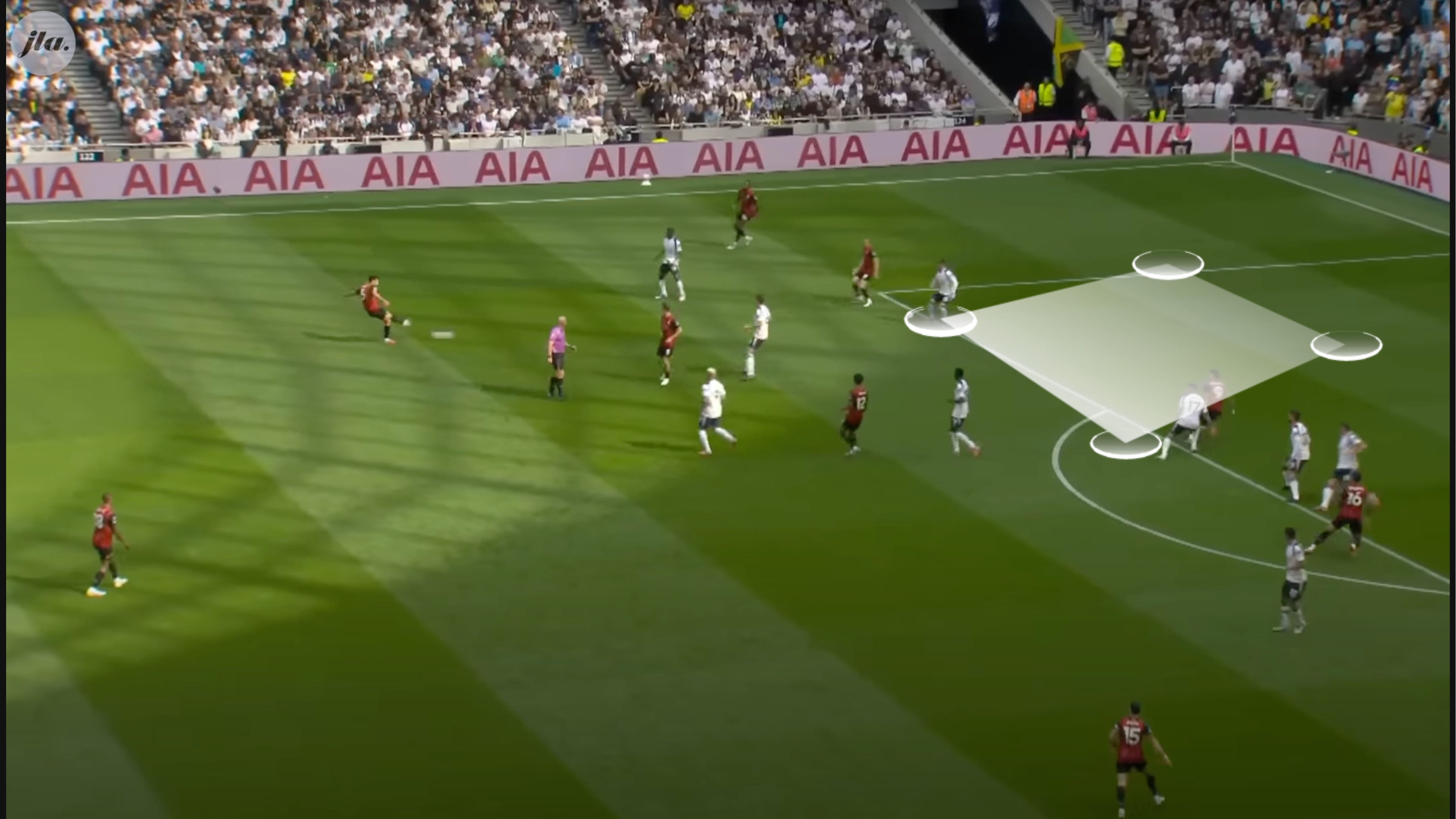 A high press against Spurs, with a lot of emphasis in cutting Cristian Romero and Pedro Porro out of the game was a masterclass from Bournemouth. This forced Guglielmo Vicario to find Micky Van de Ven, who attempted long balls up to Richarlison. This might have worked for Spurs but Bournemouth’s superior duelling, especially in the first half, meant that they were unsuccessful in getting out.