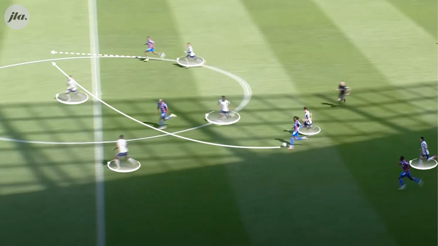 Eze, who managed three goals and one assist in three games against Postecoglou’s Spurs, showcased his abilities when he scored the second goal against Spurs in May of last season, carrying the ball through his own half, playing an outside of the foot pass through to Ismaila Sarr to take the Spurs defence out of the game, then arriving late in the box and getting on the end of the cross to finish excellently.