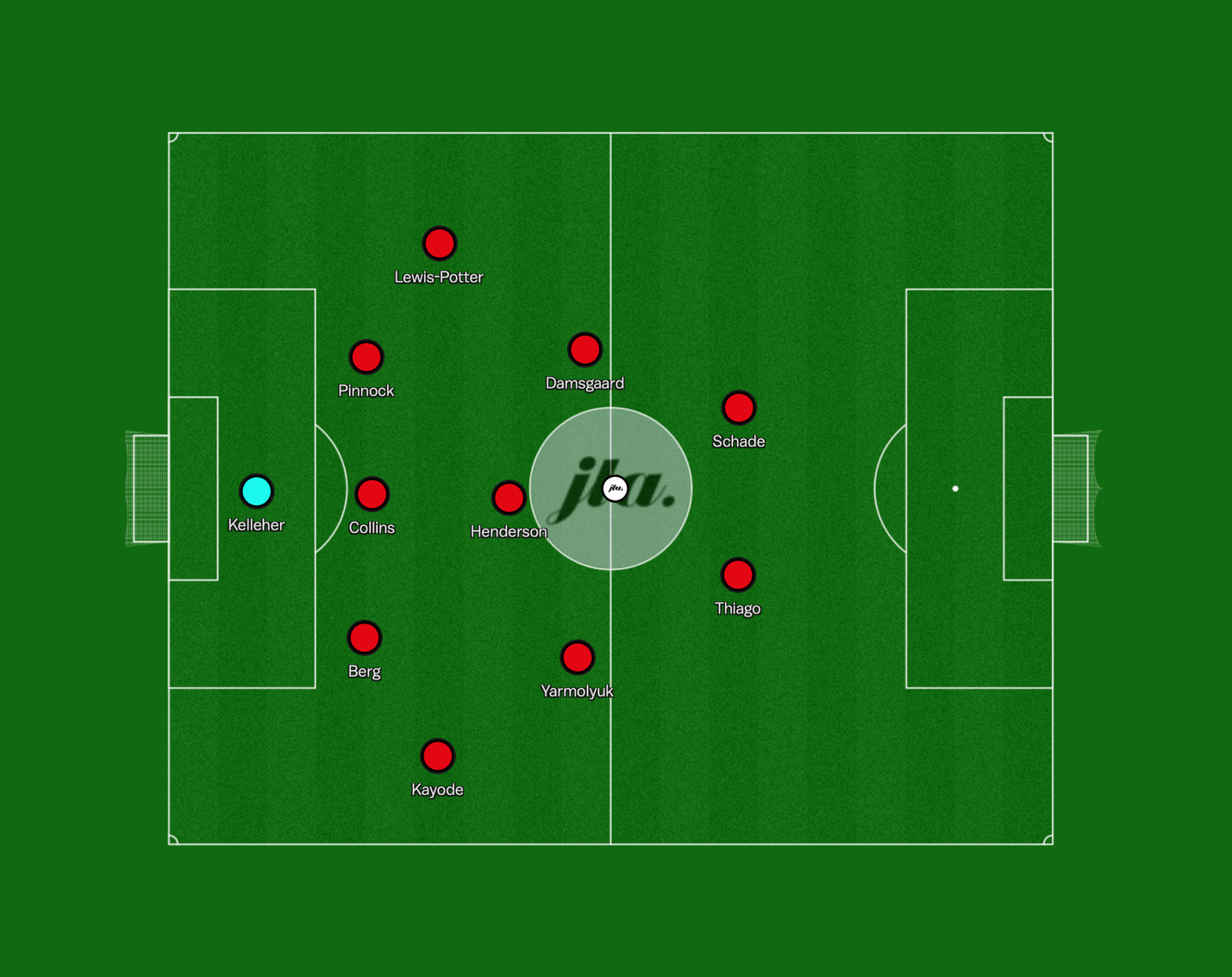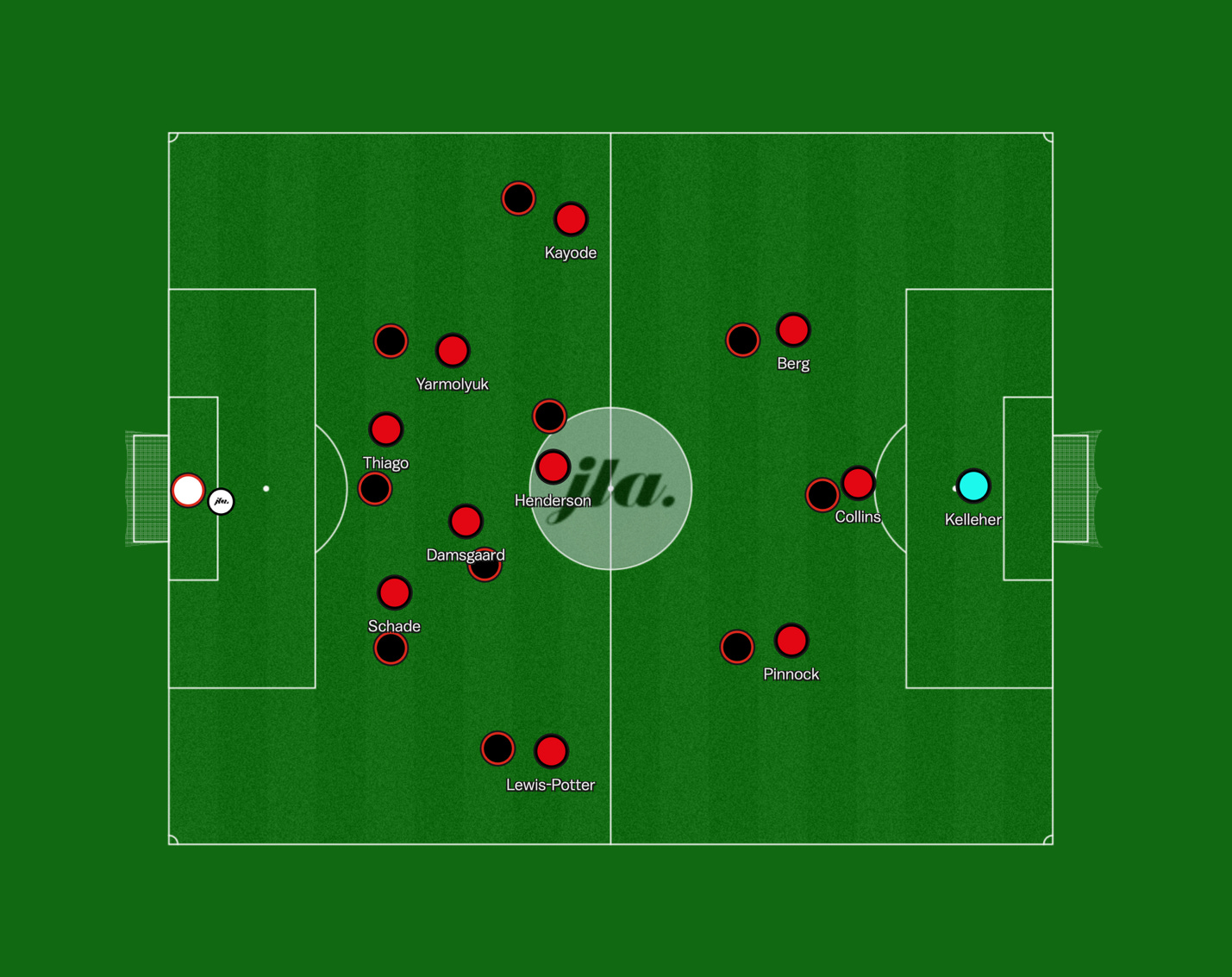 Brighton will be expected to defend in a 4-5-1 shape in the second phase of play, as we have seen from them this season in previous games, sat behind the ball looking to cut off the passing lanes through the middle with the striker putting pressure on the ball.