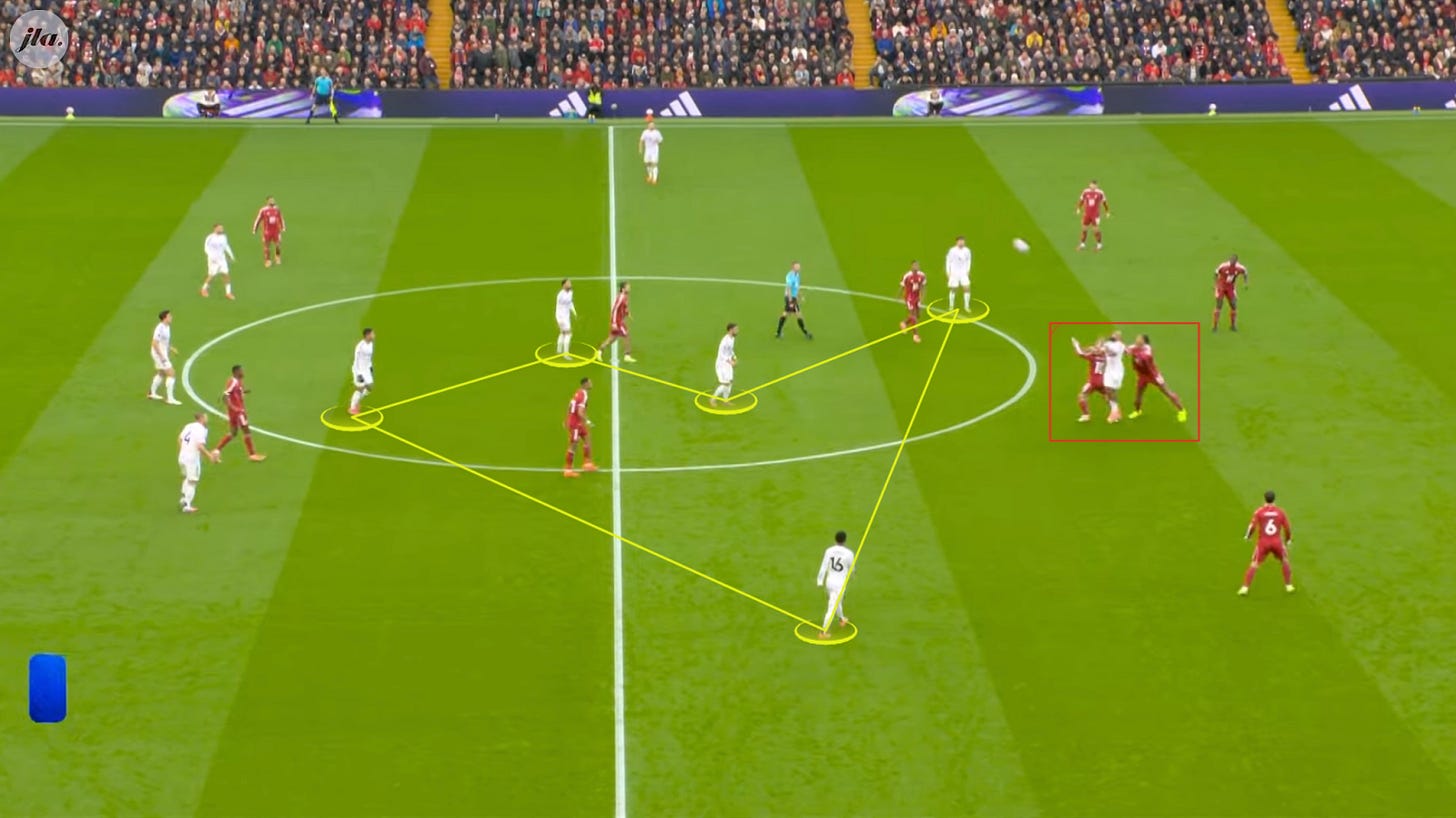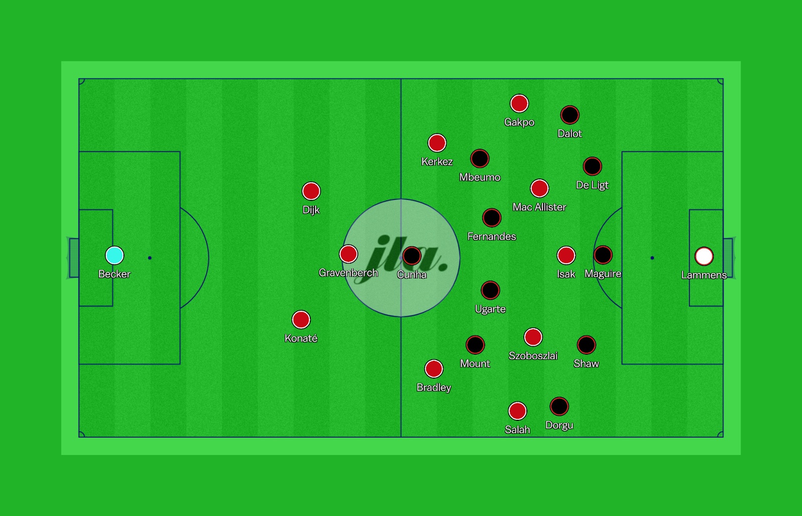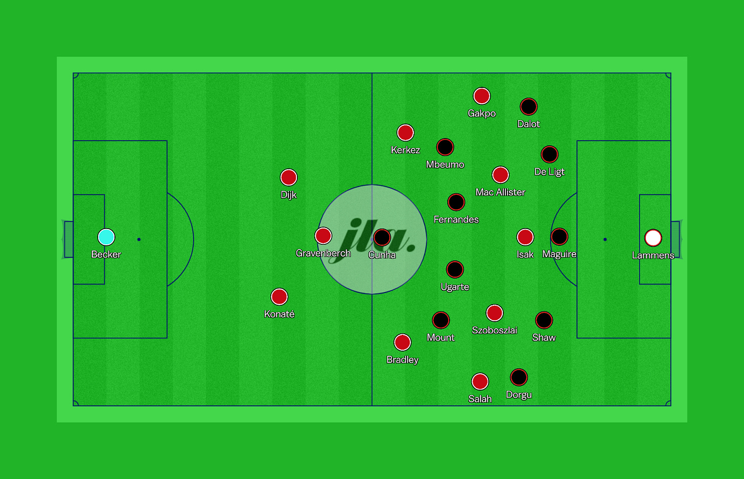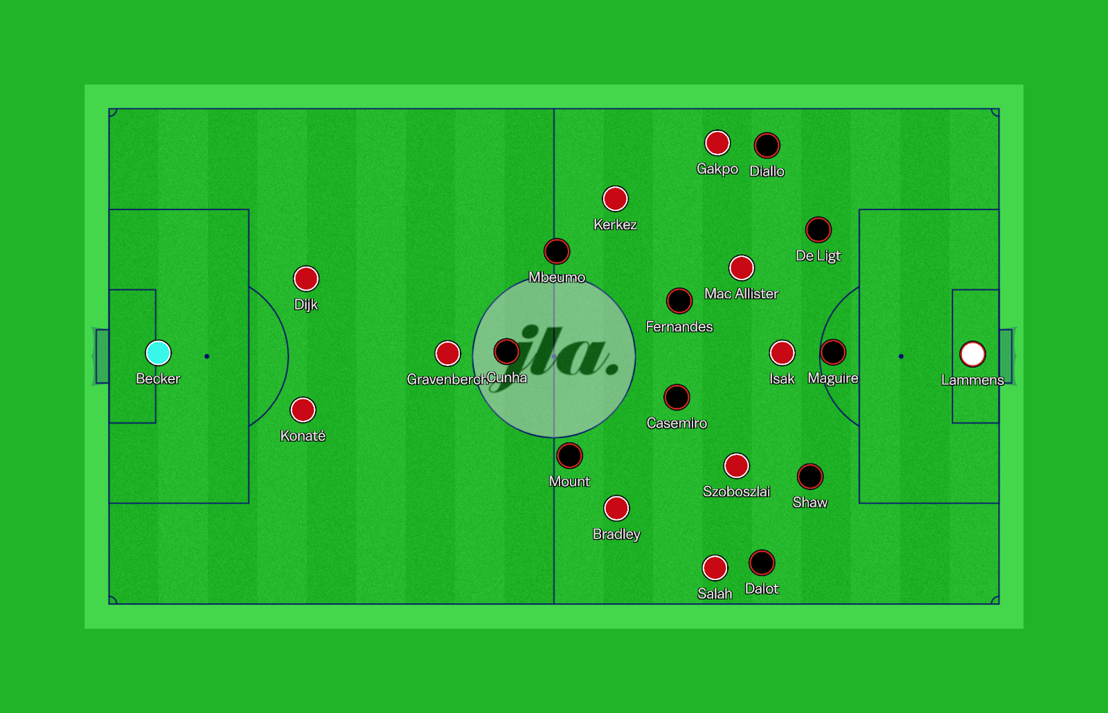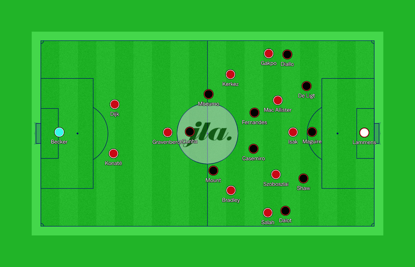From this scenario, United are able to get the ball to Amad Diallo 1v1 against Milos Kerkez, opening space for Bryan Mbeumo to attack on the blind side of Virgil van Dijk, causing an issue for the Liverpool defensive line as they tried to pass the man on, allowing United to take the lead after just 62 seconds and change the frame of the contest.