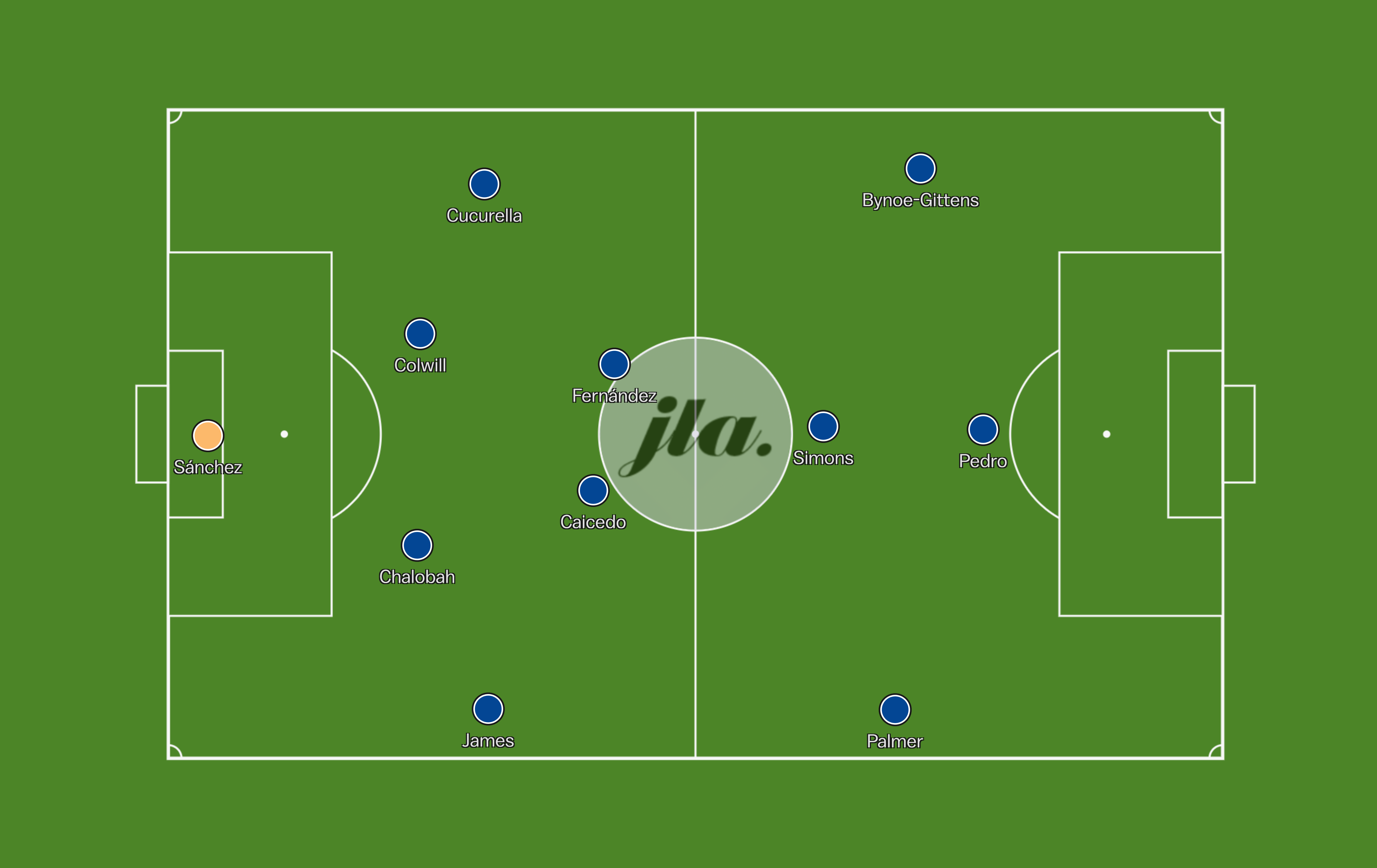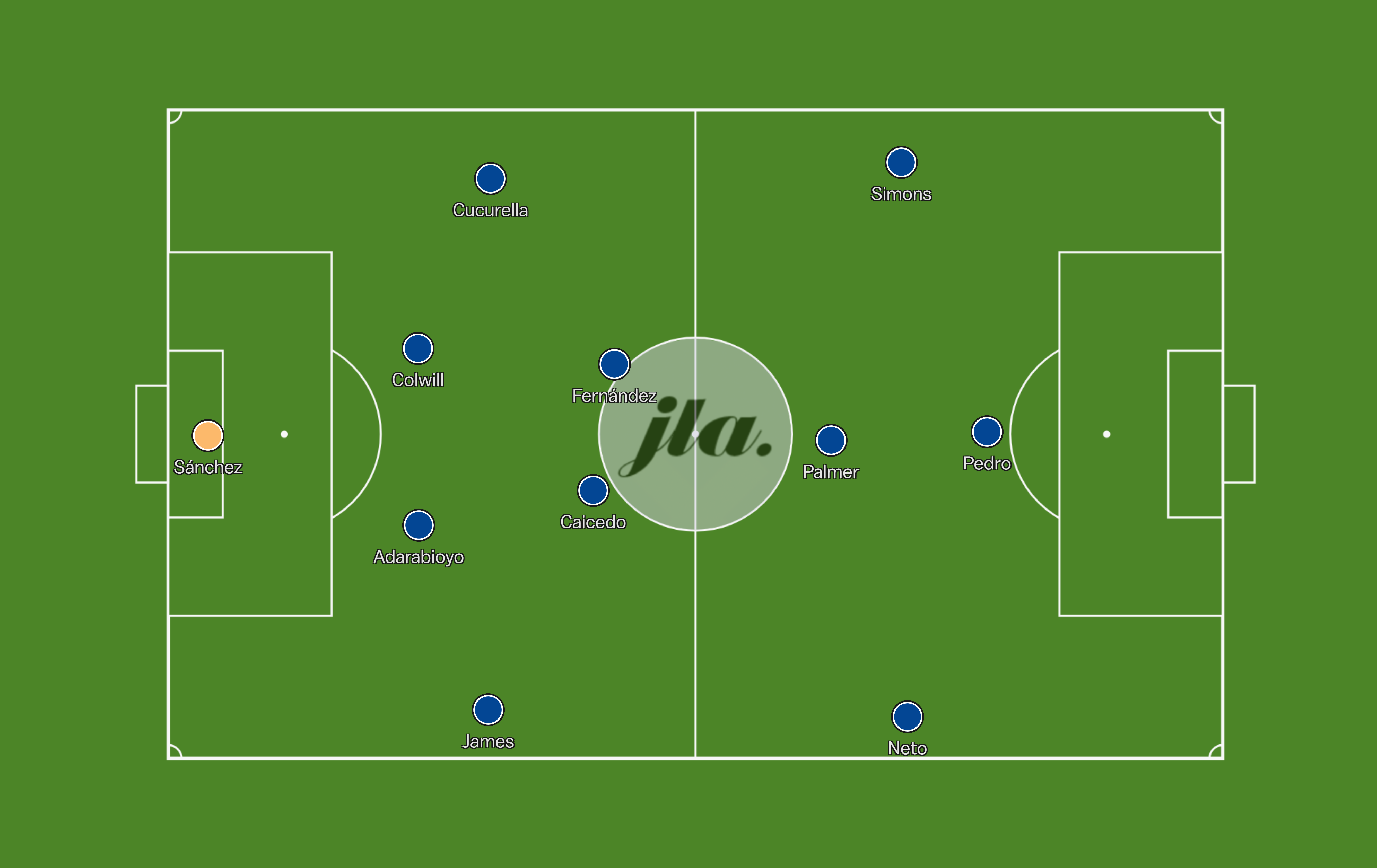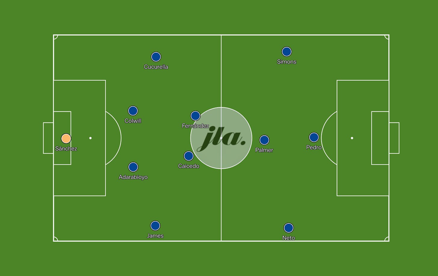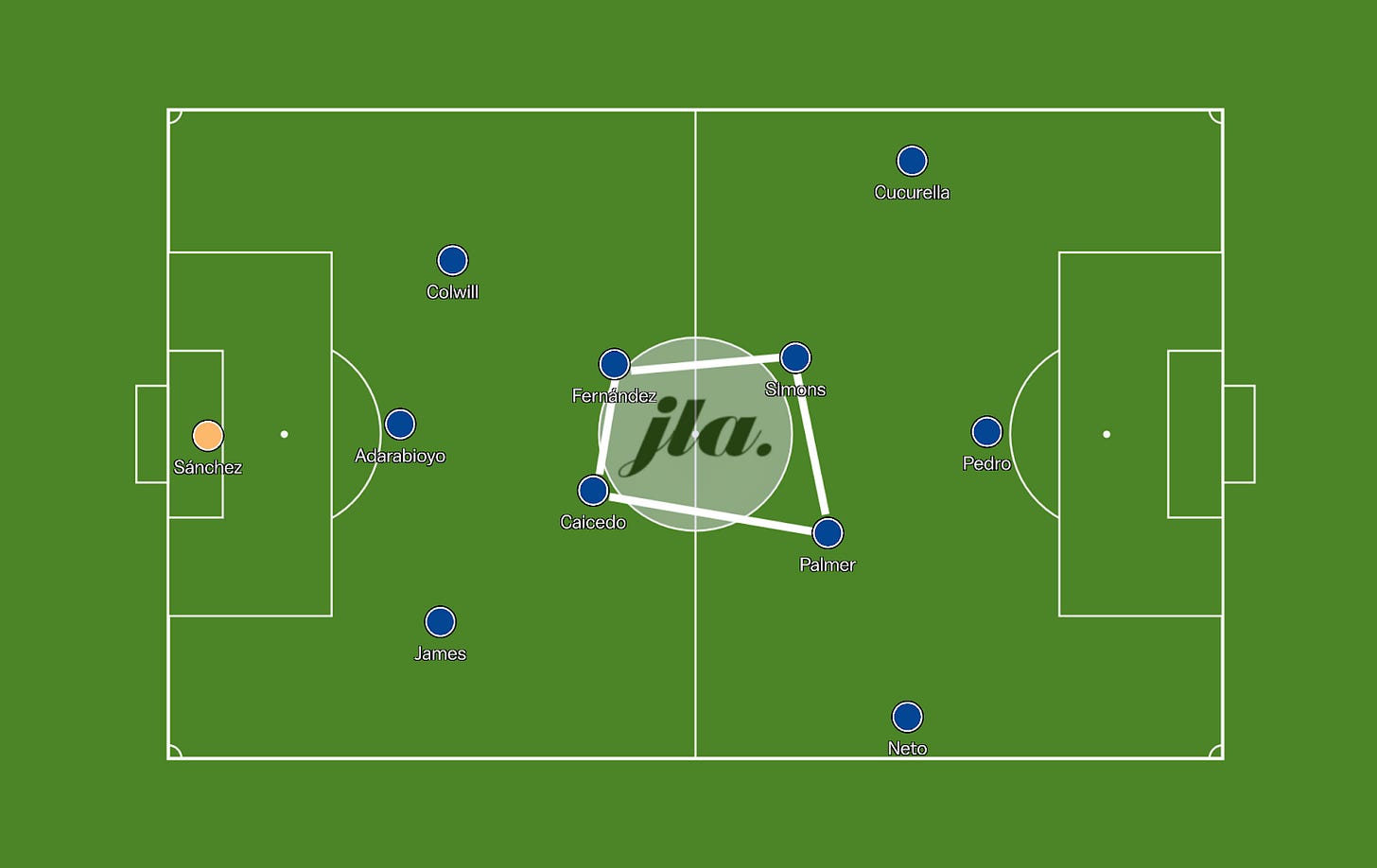 Simons would start on the left, drifting infield to operate in the left space. Palmer would be the number ten, still operating in the right half space and Pedro Neto would be on the right wing holding the width.