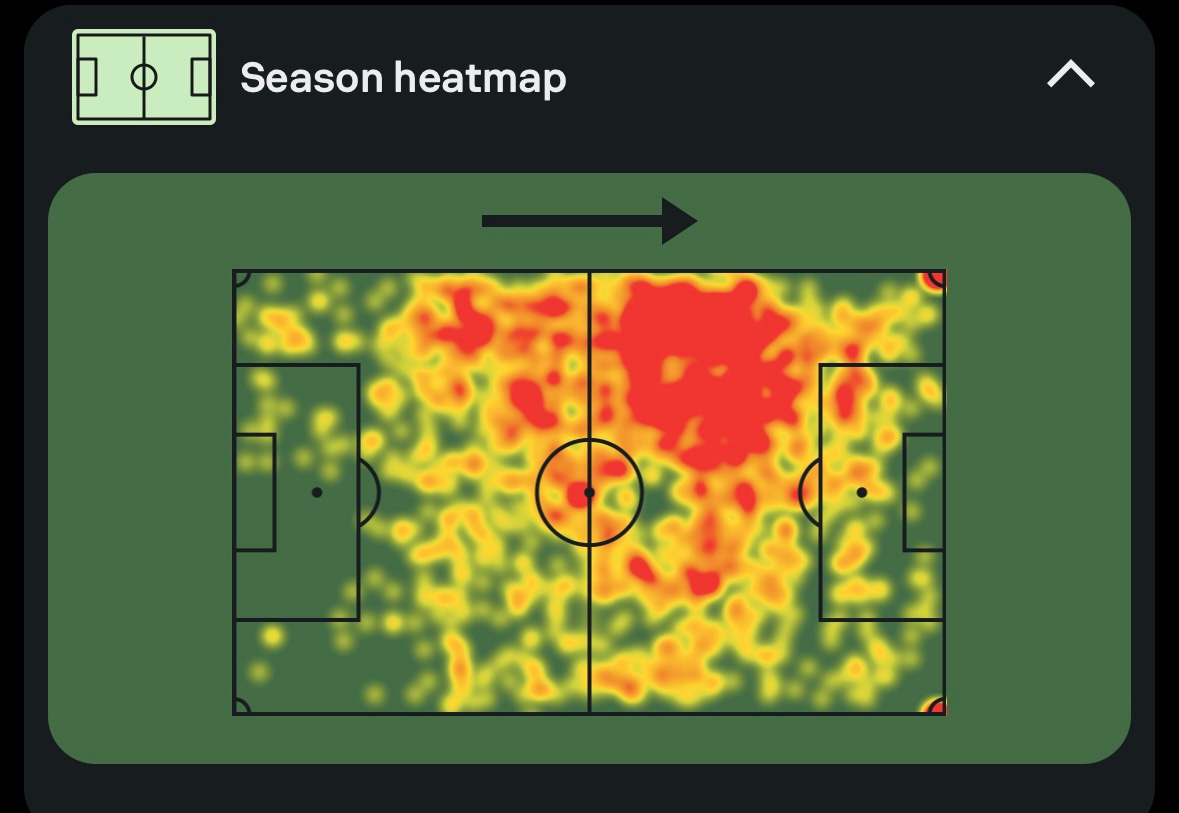 Here is Simons’ heatmap from the 2024/25 season at Leipzig, where he featured as a left attacking midfielder in a 4-2-2-2. Whilst RB Leipzig didn't start with wingers on paper, Simons’ position would allow him to drift wide to receive the ball, having plenty of freedom between wider zones and that left half space.
