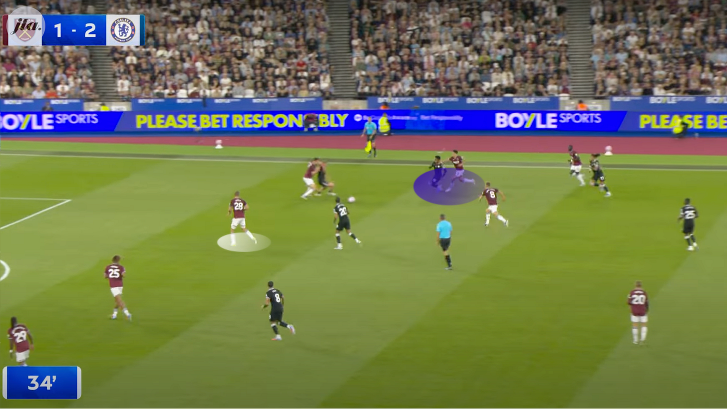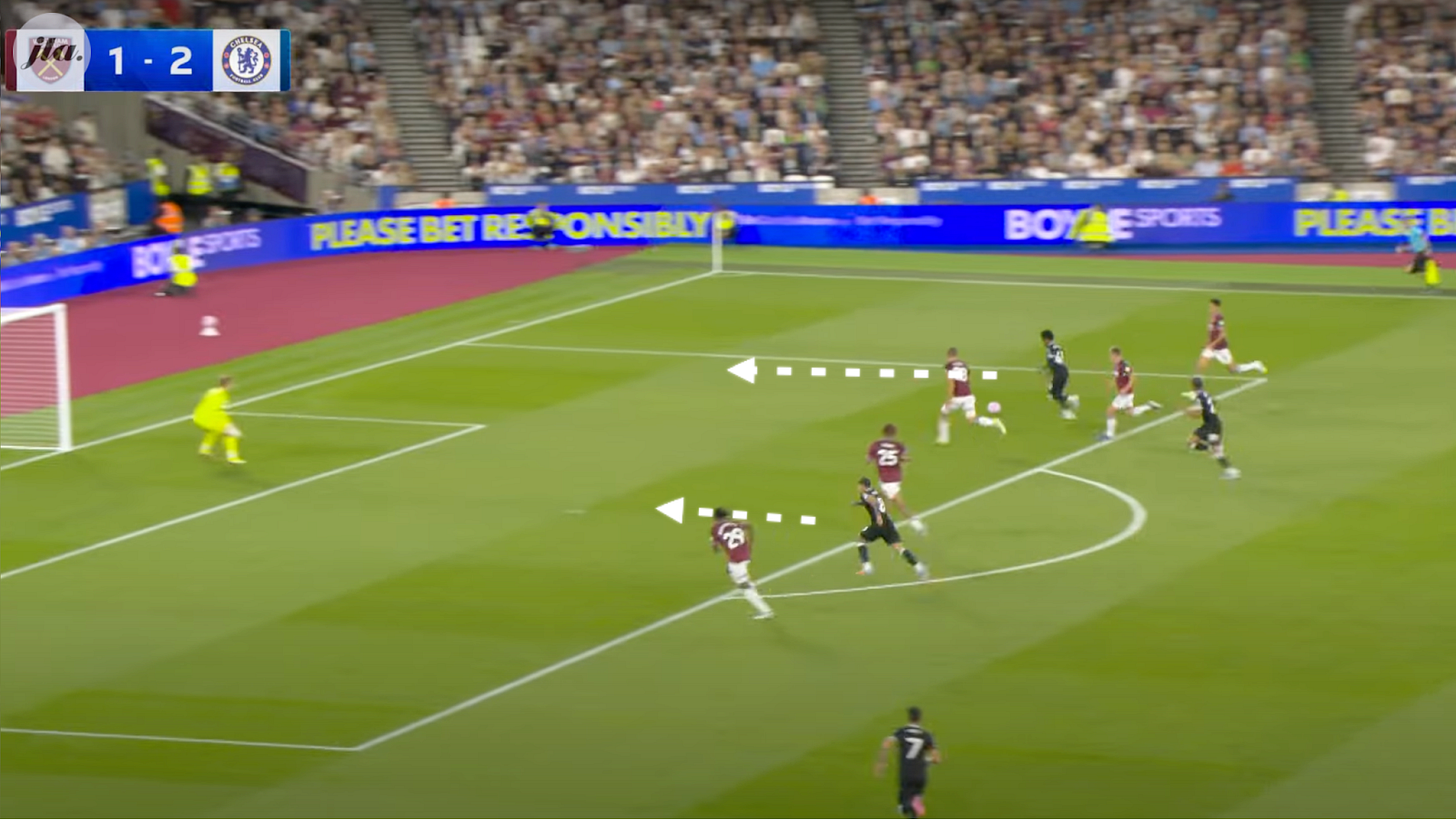 The wide players, Neto and Gusto, hold the width, occupying the opposing wingbacks whilst the two 10s, Estevao and Fernandez, tuck in. This causes a headache for the West Ham defenders (as we saw above in West Ham’s defending of the third goal). By overloading the final third and allowing Estevao and Fernandez a more free, roaming role, West Ham’s back-3 is in two minds of whether to press and shut-down the two 10s or maintain position.