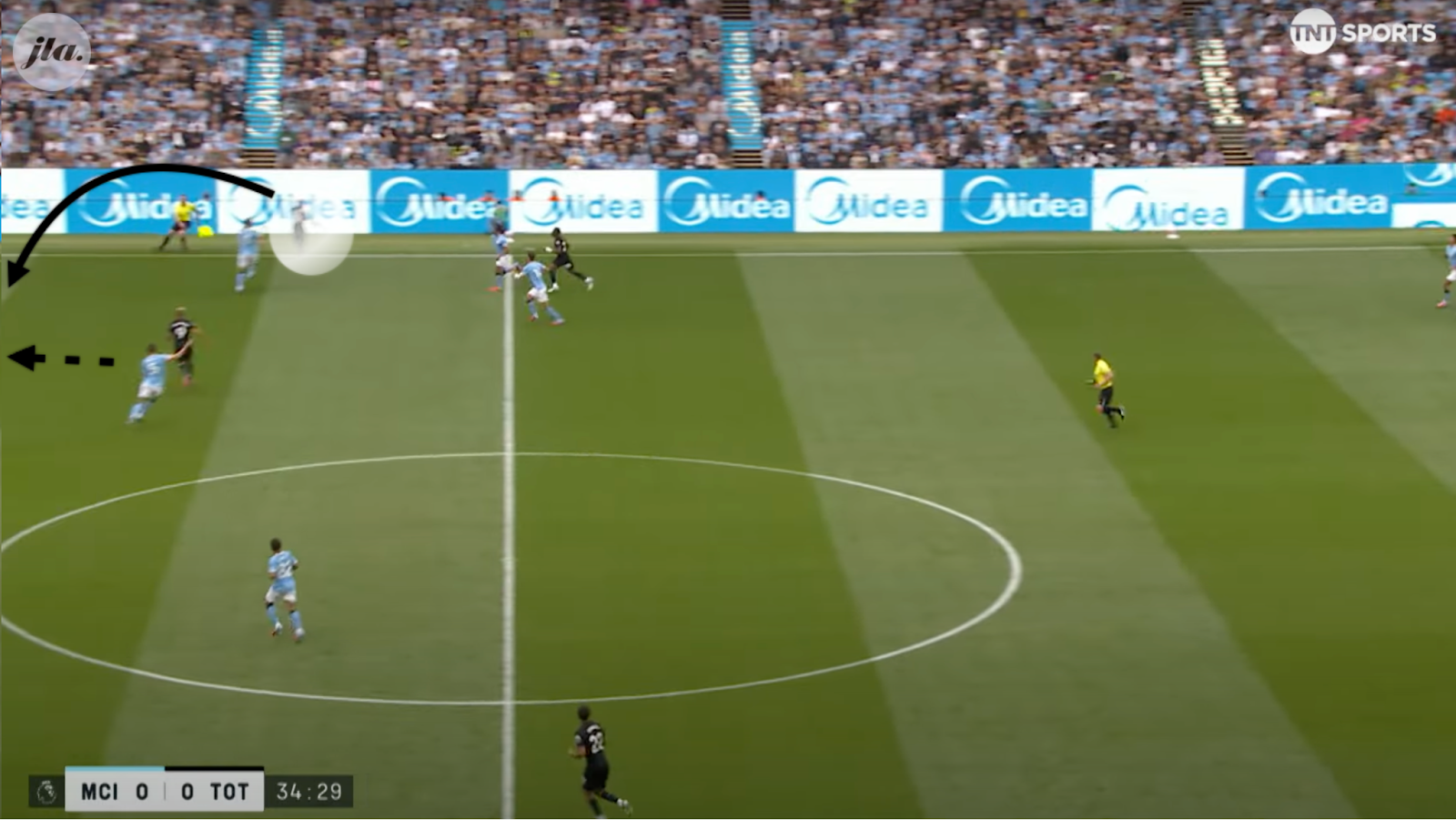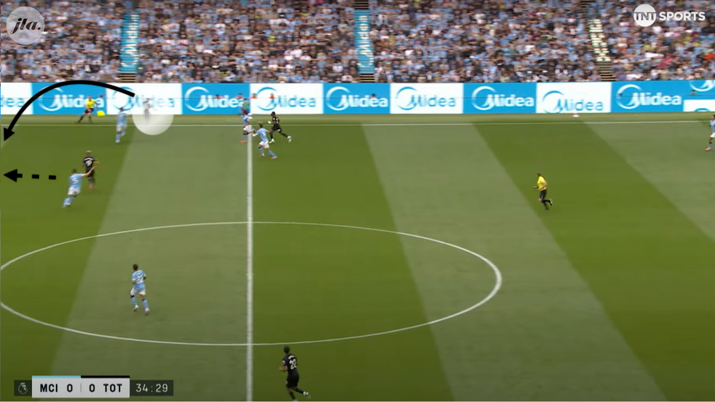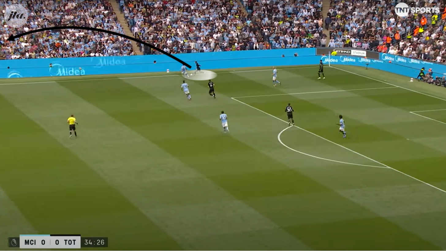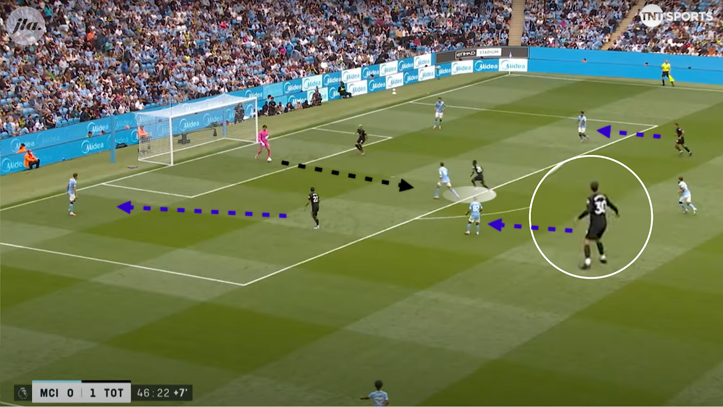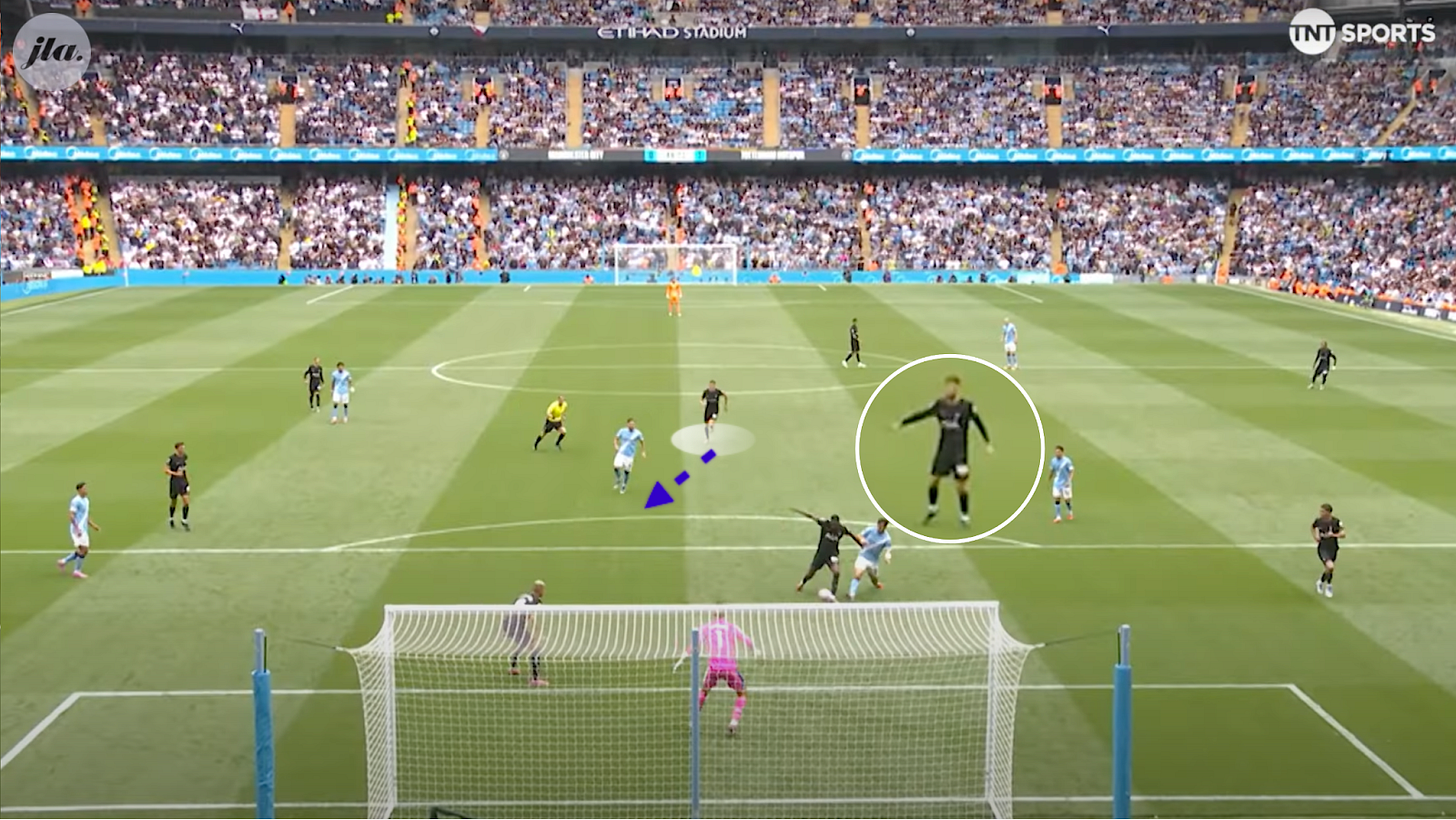 Van de Ven. The Spurs centreback is busting a gut to shut down Cherki who was close to the edge of his own box. What initially appears to be an unprompted mistake from the keeper, this only comes about because of this aggressive press. This resulted not only in the second goal, displayed above, but also disrupted Man City’s normal fluidity and ability to play through the lines.