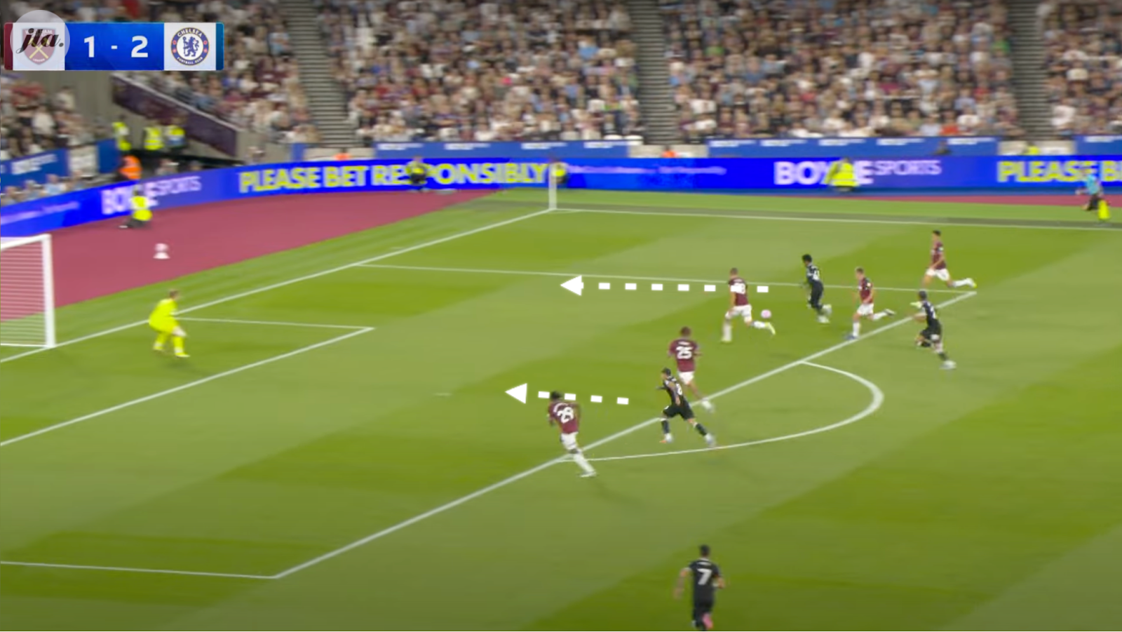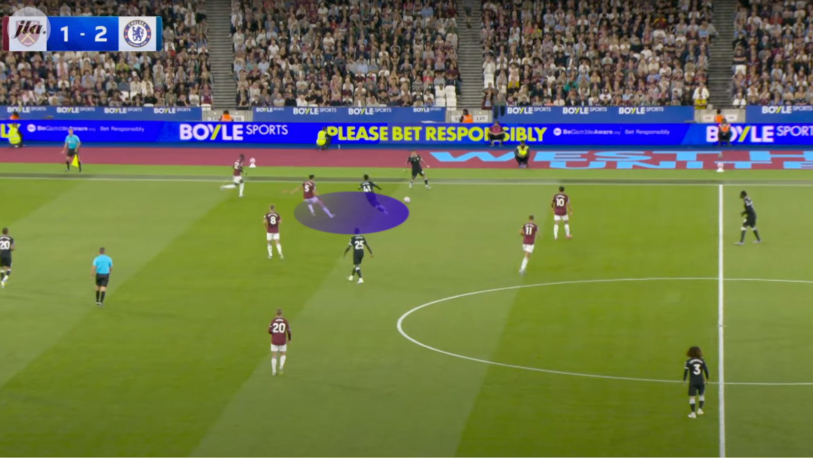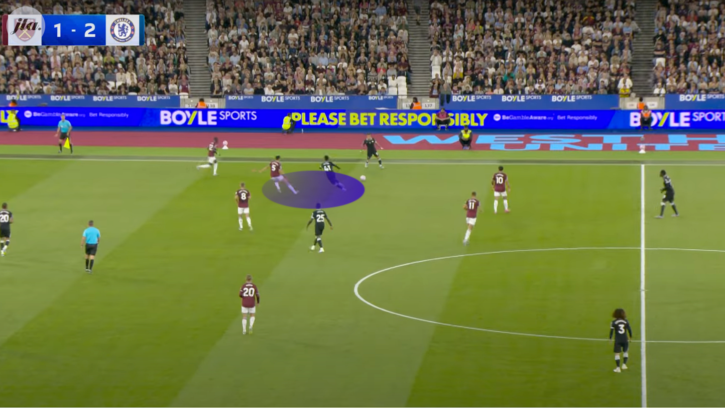Soucek, a midfielder in the double pivot, now has to drop into defense to cover the rogue Todibo. This opens up plenty of space for Chelsea's attacking players, with Joao Pedro (20) and Fernandez (8), as we can see above, in acres of space.