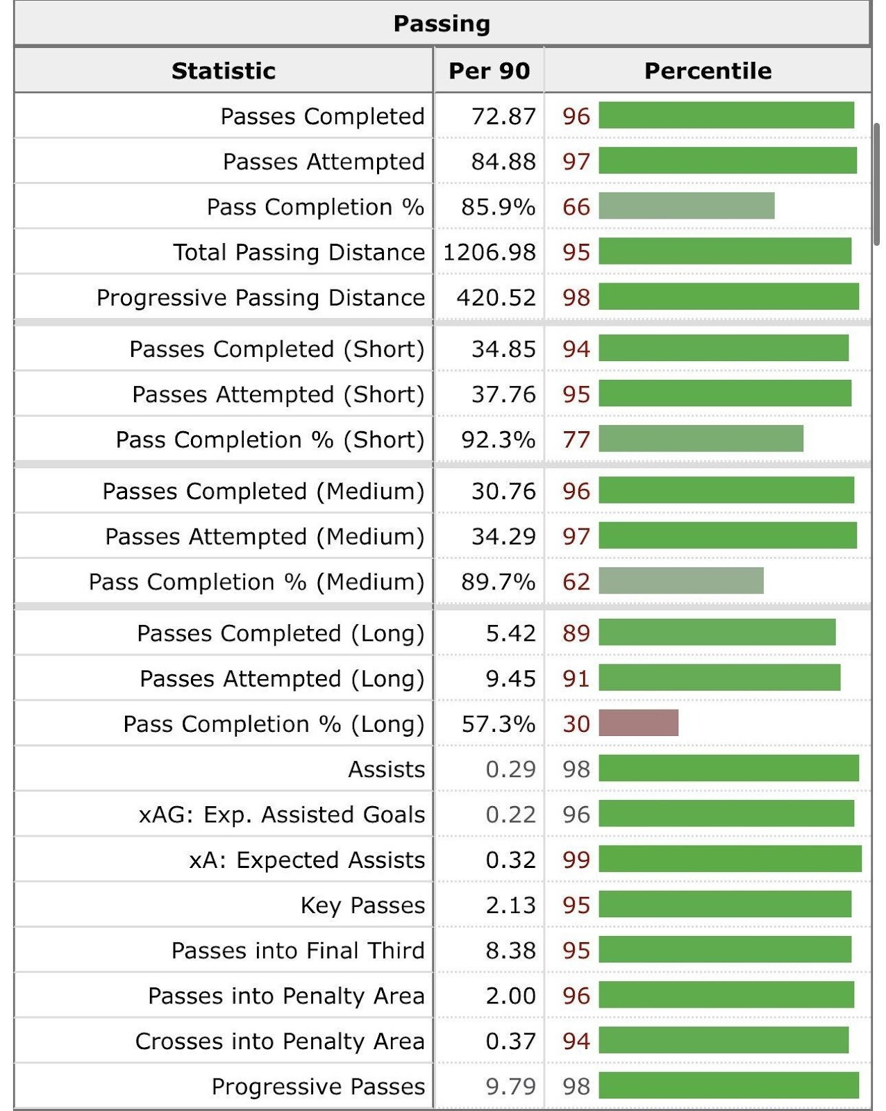 A dictator of games is a label that often carries negative connotations in the English game. I think back to someone like Jorginho, whose game took years to be appreciated by many fans in England. However, while Stiller fits that profile, he offers so much more than just his passing ability. He’s a genuine final-third threat as well: he contributed 1 goal and 8 assists last season and already has 1 goal and 3 assists in the current campaign. Moreover, his 4.64 shot-creating actions per 90 rank him in the 97th percentile among midfielders in Europe’s top five leagues - higher than the likes of Vitinha and Bellingham!
