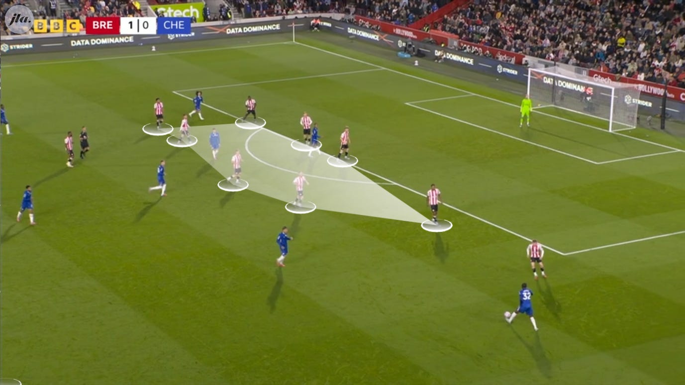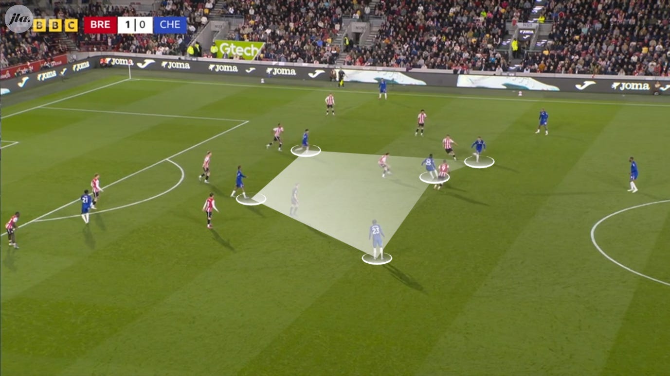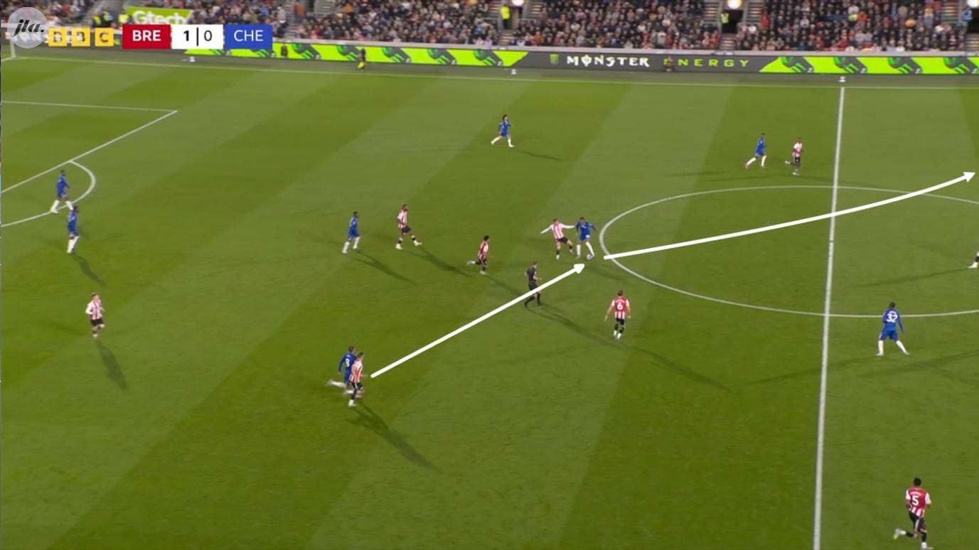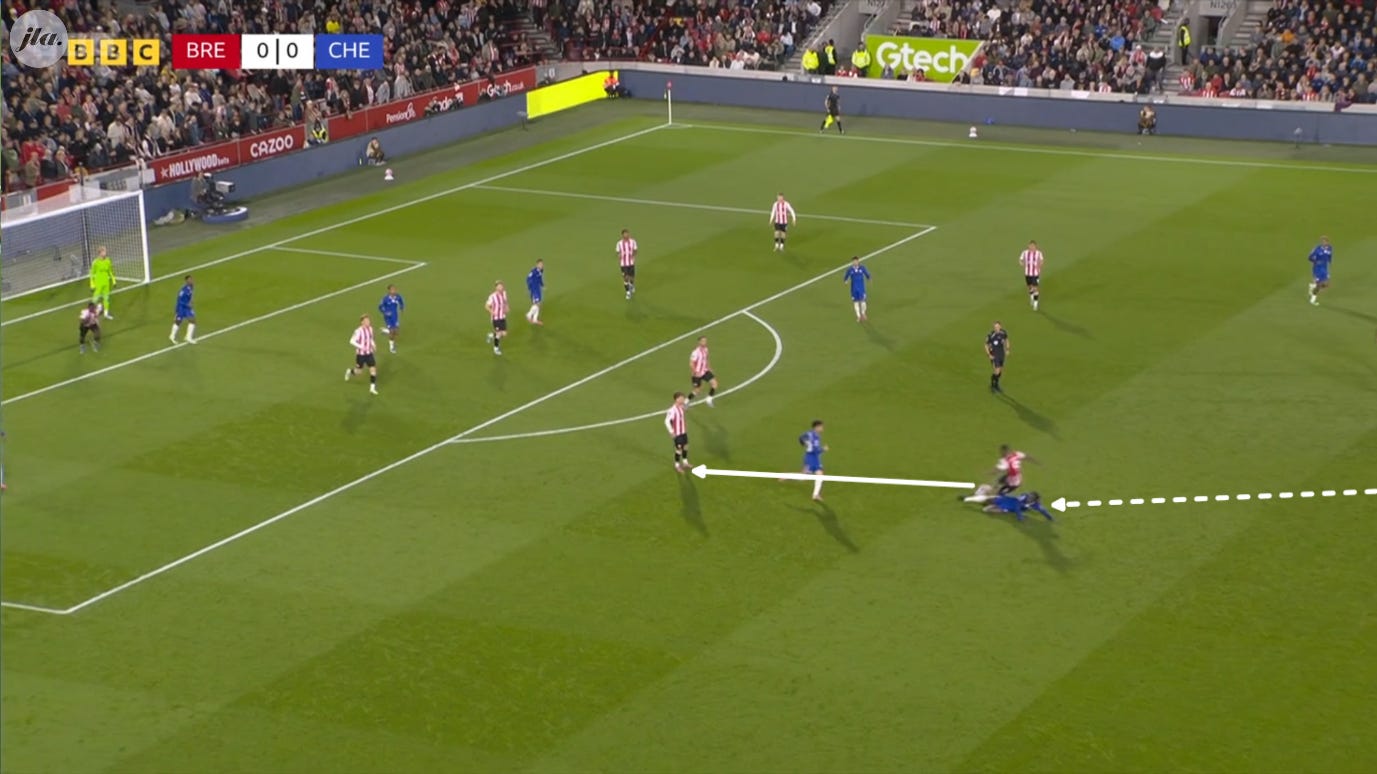 Above, Enzo Fernandez wins the ball back and fires it into Joao Pedro, who turns and plays the ball forward before Brentford can transition into a settled defence.