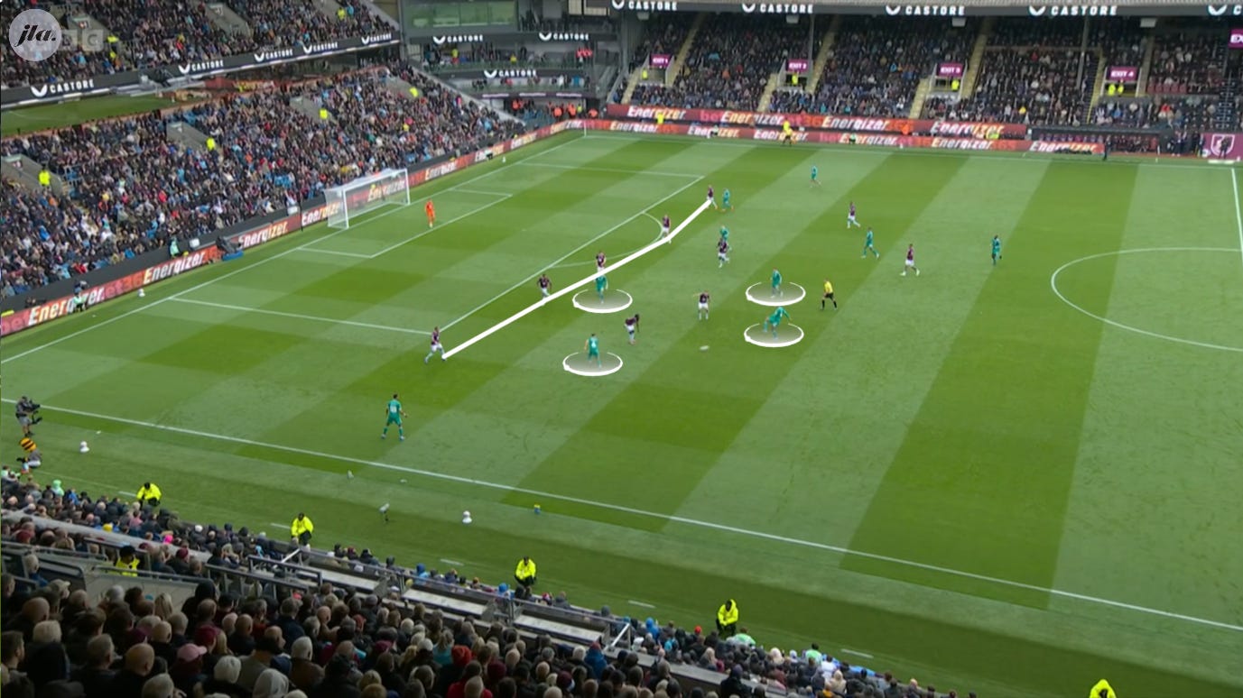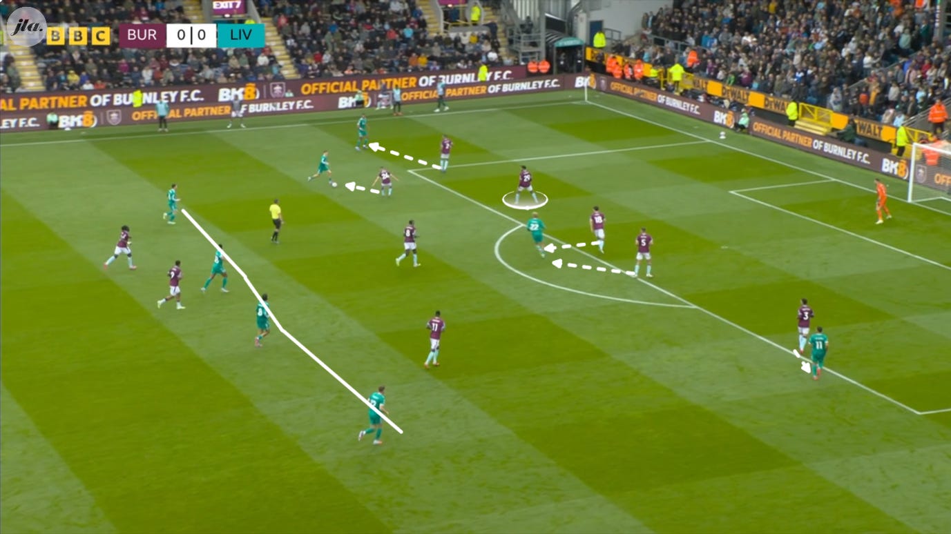 This allowed Burnley to remain passive in their defensive shape, never being drawn out of their 5-4-1. Even after some substitutions, the Reds remained risk averse, applying very little pressure on the Clarets’ backline and often leaving Wirtz, Gakpo, Ekitike and Salah outnumbered or in non-threatening positions.