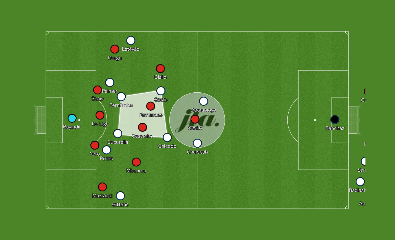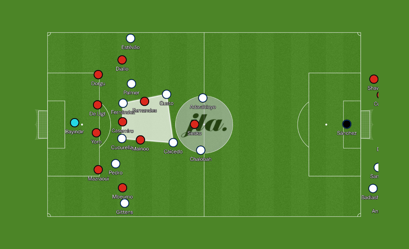 Contrast this to the assured, meticulously planned build-up of Chelsea. They have reliable, press-proof players in the appropriate positions, and Maresca’s 3-box-3 enables them to progress the ball between the lines in consistent patterns.