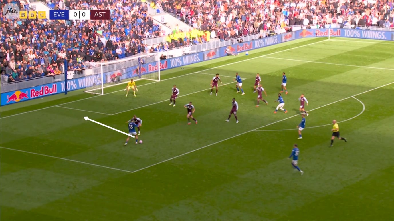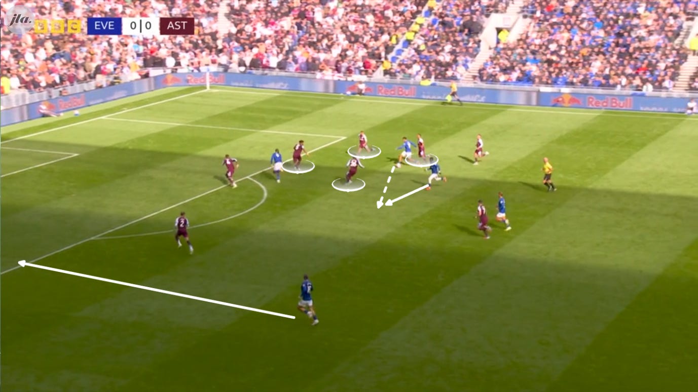 This was the source of some of Everton’s best chances last weekend. Both wingers are so confident driving in possession that they can cause panic among opponents – as seen by the fact that four Villa players converged on Ndiaye in the image below.