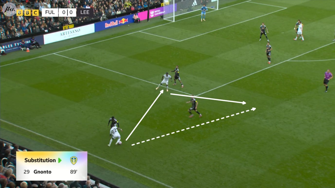 The 22-year-old revived the home fans in the closing stages with his trickery and direct play. He drew Leeds defenders towards him and showed his diverse skillset – nearly scoring a screamer after a quick one-two and repeatedly driving towards the box.