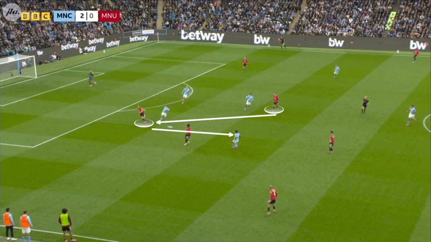 It essentially means that they always have four players in central areas able to circulate and progress the ball. Compare that to United’s two in midfield, and the potential story of Saturday’s clash between the two starts to write itself.