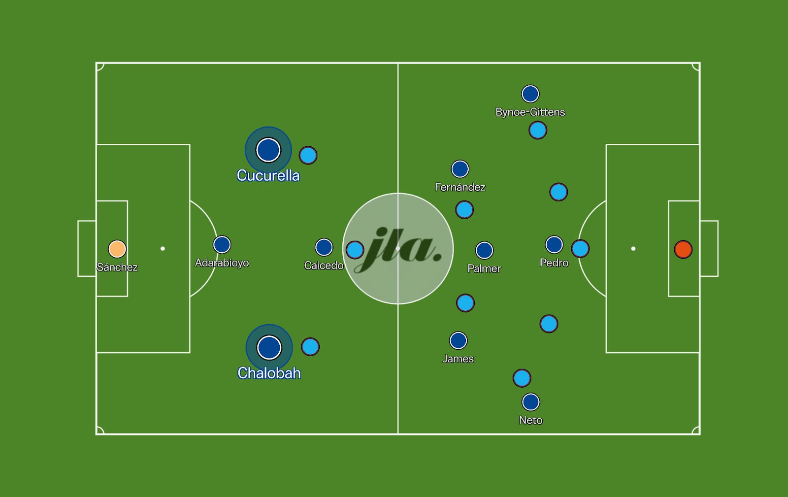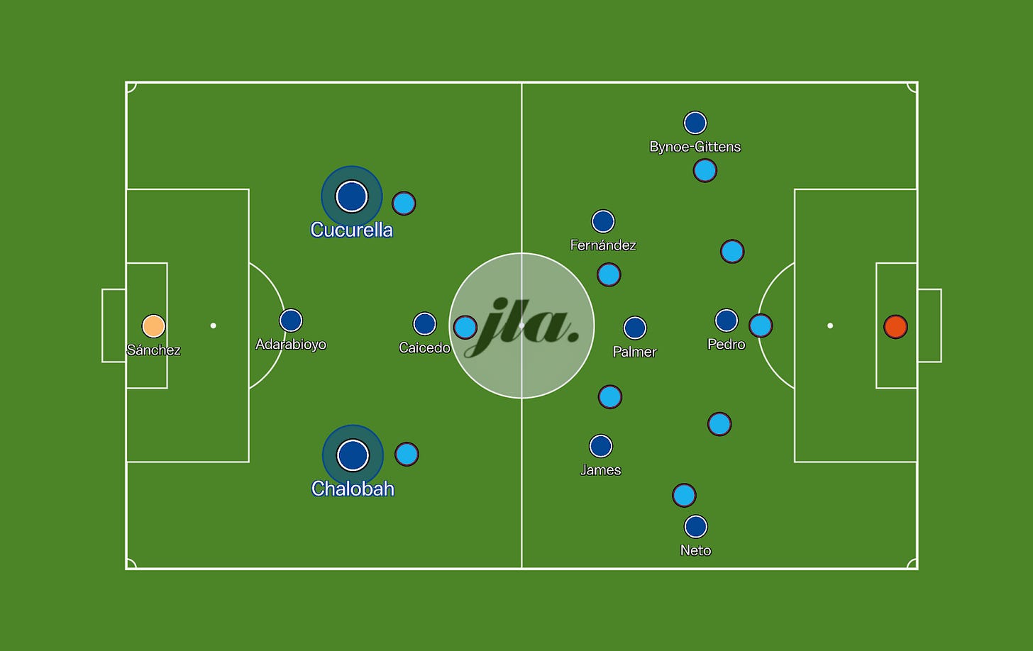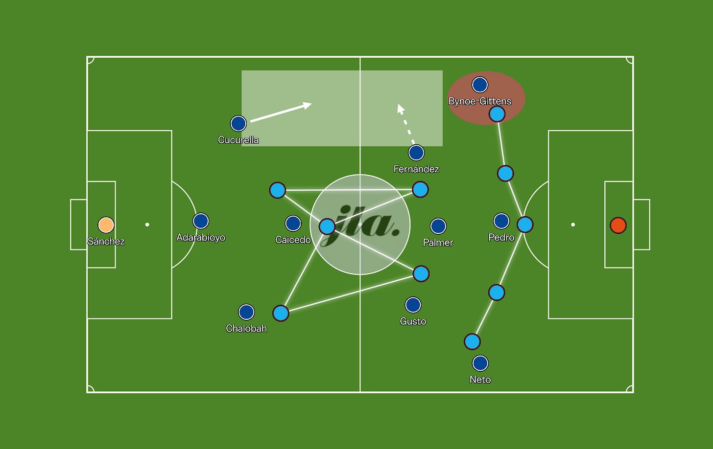 Several issues prevented Maresca’s side from effectively playing through the lines, as Levi Colwill and Tosin Adarabioyo were unavailable, whilst Trevoh Chalobah had to play on the left side of defence, which isn’t optimal for his passing angles due to his right foot bias.