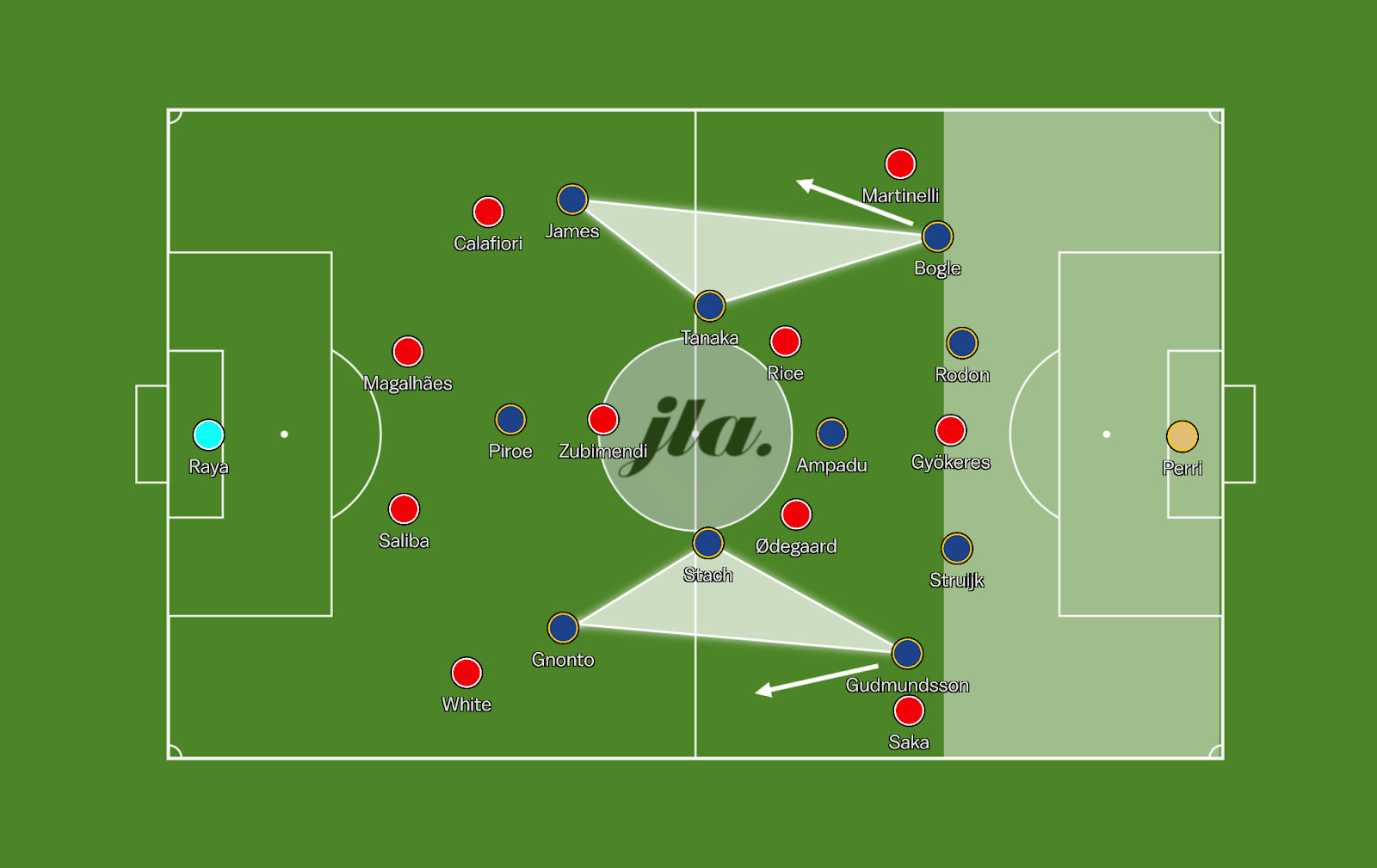 If Leeds are able to win the battle, Arsenal will struggle to deal with the combinations and movement in wide areas, whilst if Arsenal win the battle, the likelihood of catching the Leeds fullbacks out of position as they go to join the attack will be high, leaving space for the Gunners to hurt them in transition at pace.