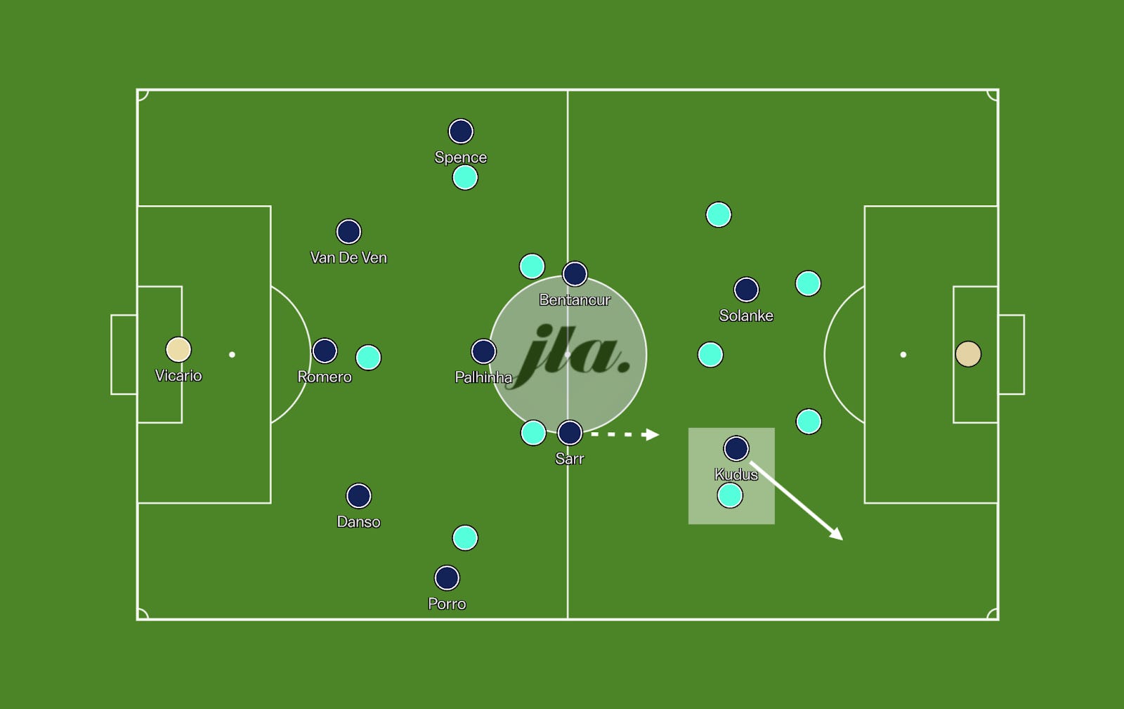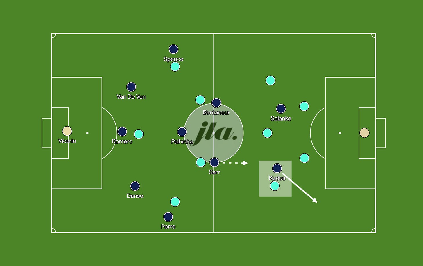 With Ait-Nouri being aggressive to jump up in the counter press, Mohammed Kudus will have the opportunity to exploit the space behind the fullback, which will likely be Tottenham’s best route for generating chances in this game.
