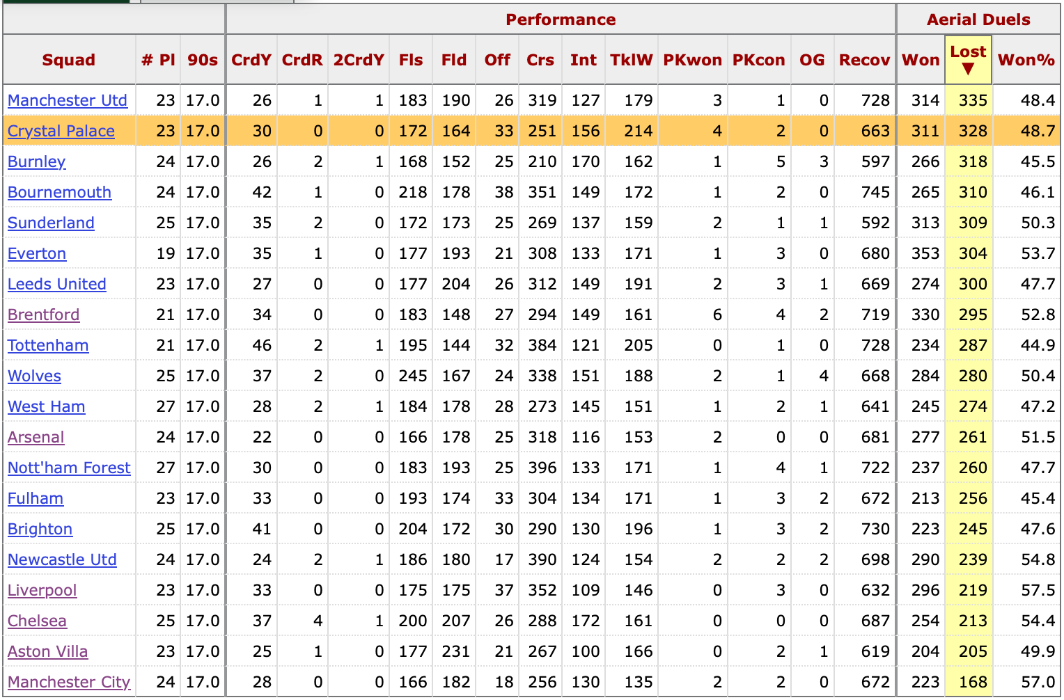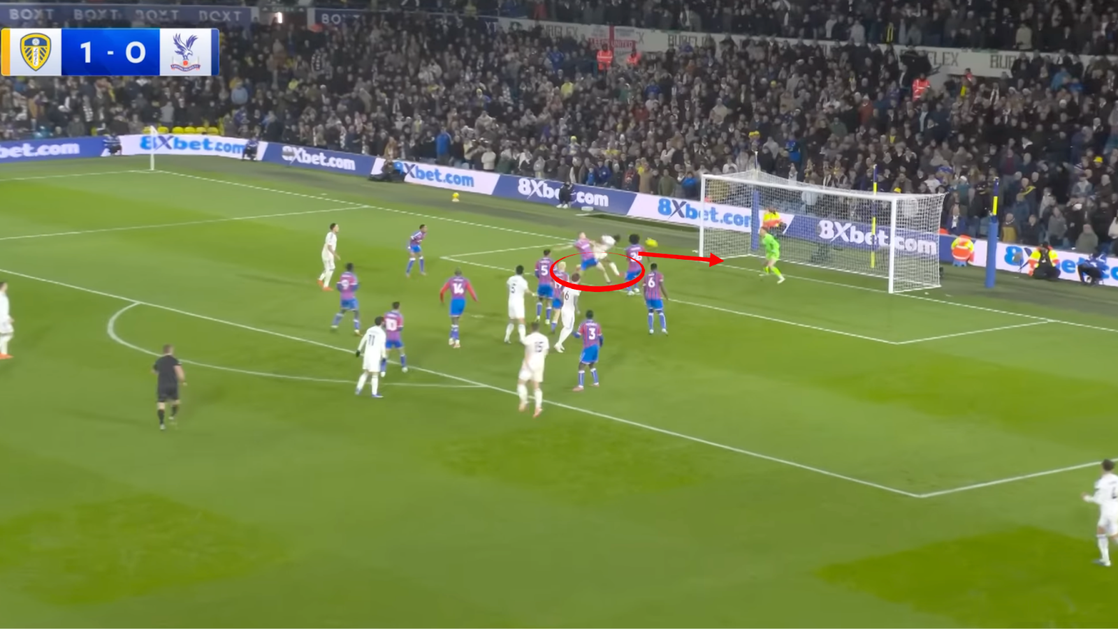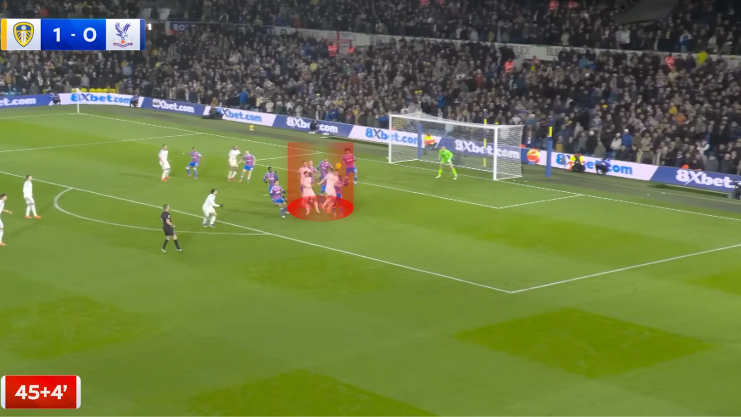 This weakness was evident against Leeds. In competitive aerial situations, where either player could win the ball, Palace players often failed to get to both the first and second ball.