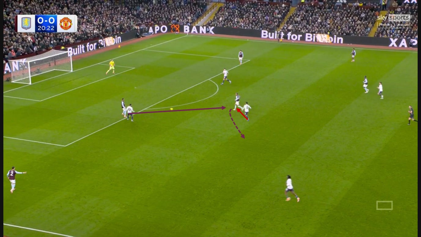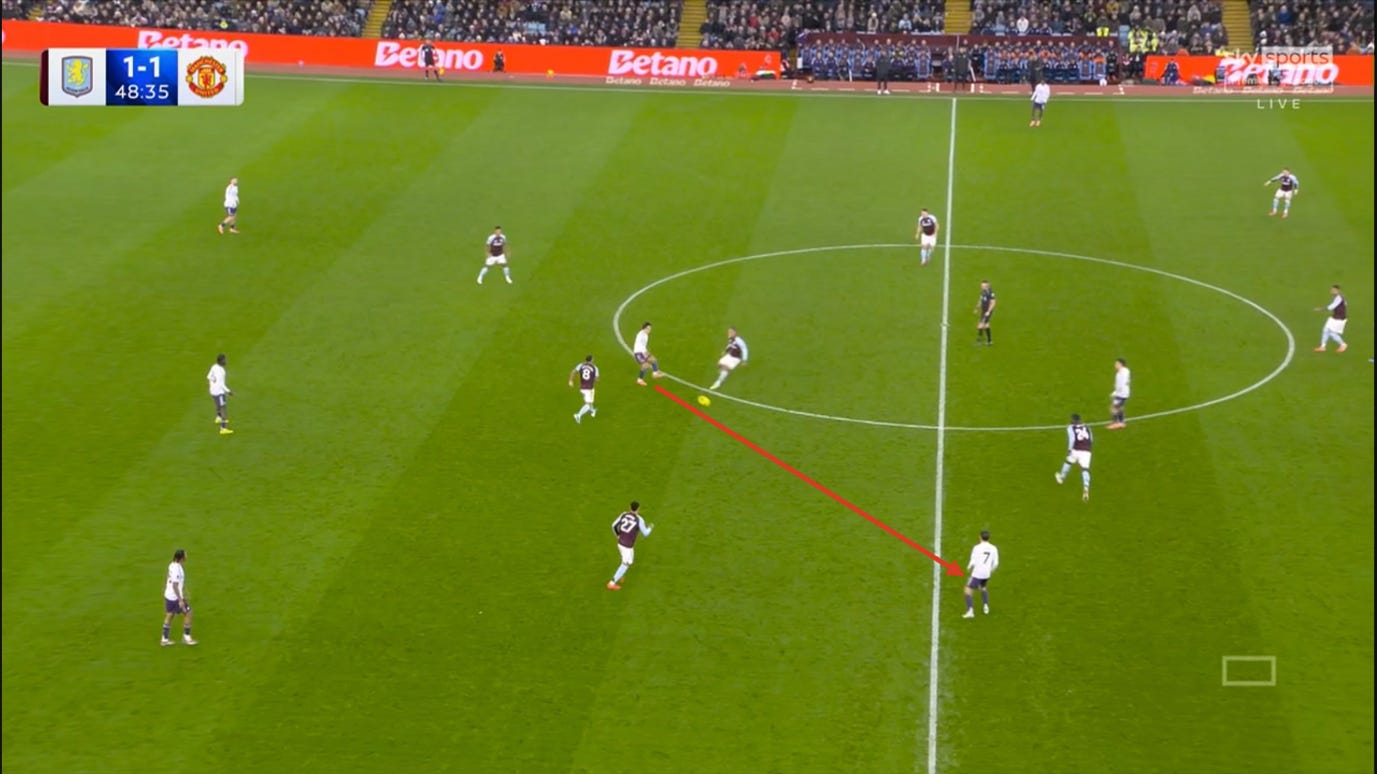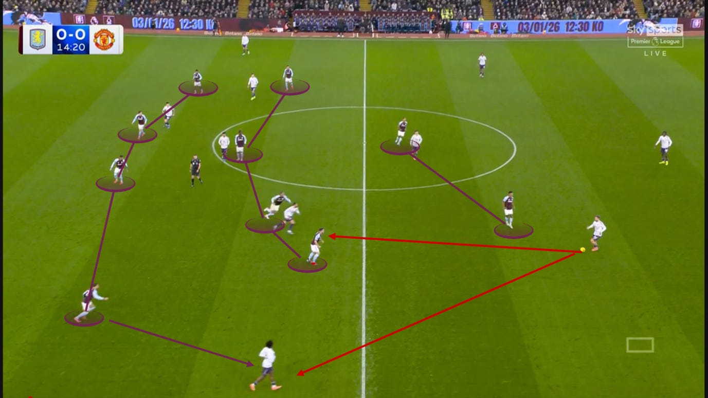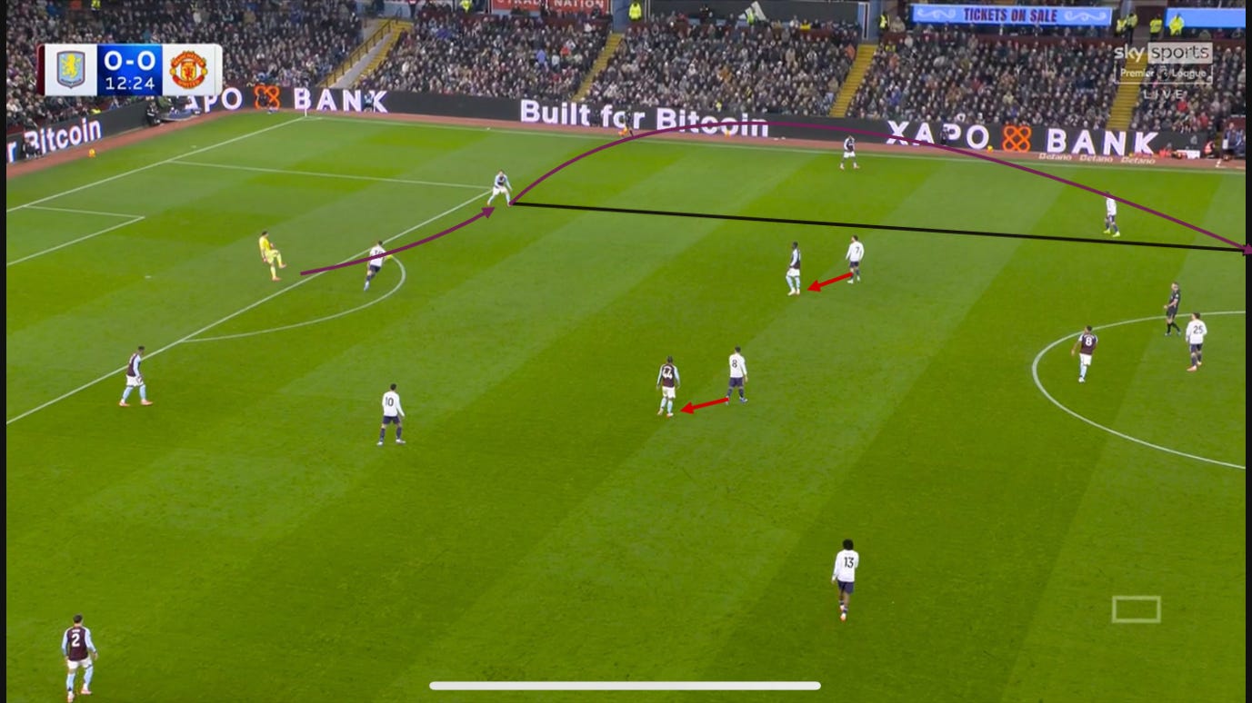 United were insistent on having a two-player advantage at the back, which meant that Villa outnumbered Ruben Amorim’s side in the middle third. Mason Mount and Bruno Fernandes were frequently marked out of the game by two players, leaving United with very little penetration in their ball progression.