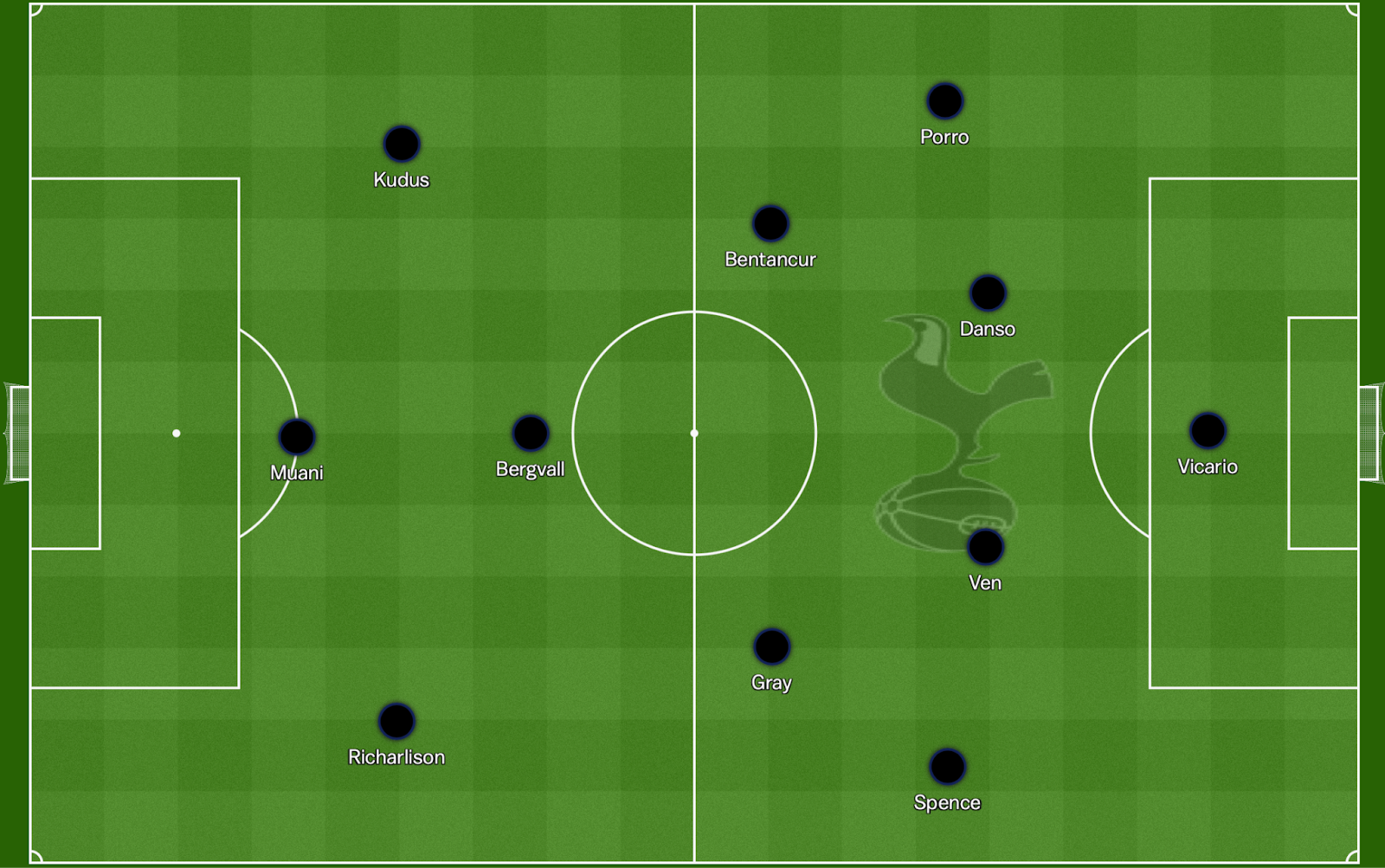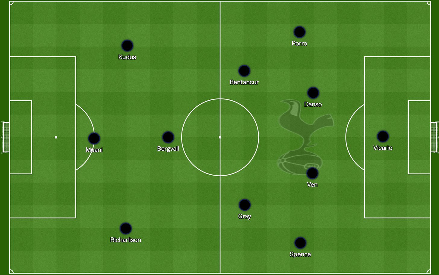 After losing Romero and Simons to red cards against Liverpool, I think Richarlison and Danso will replace them. Richarlison will play, as he has done in the past, on the left wing but float inside – allowing Bergvall and Spence to cover the flank.