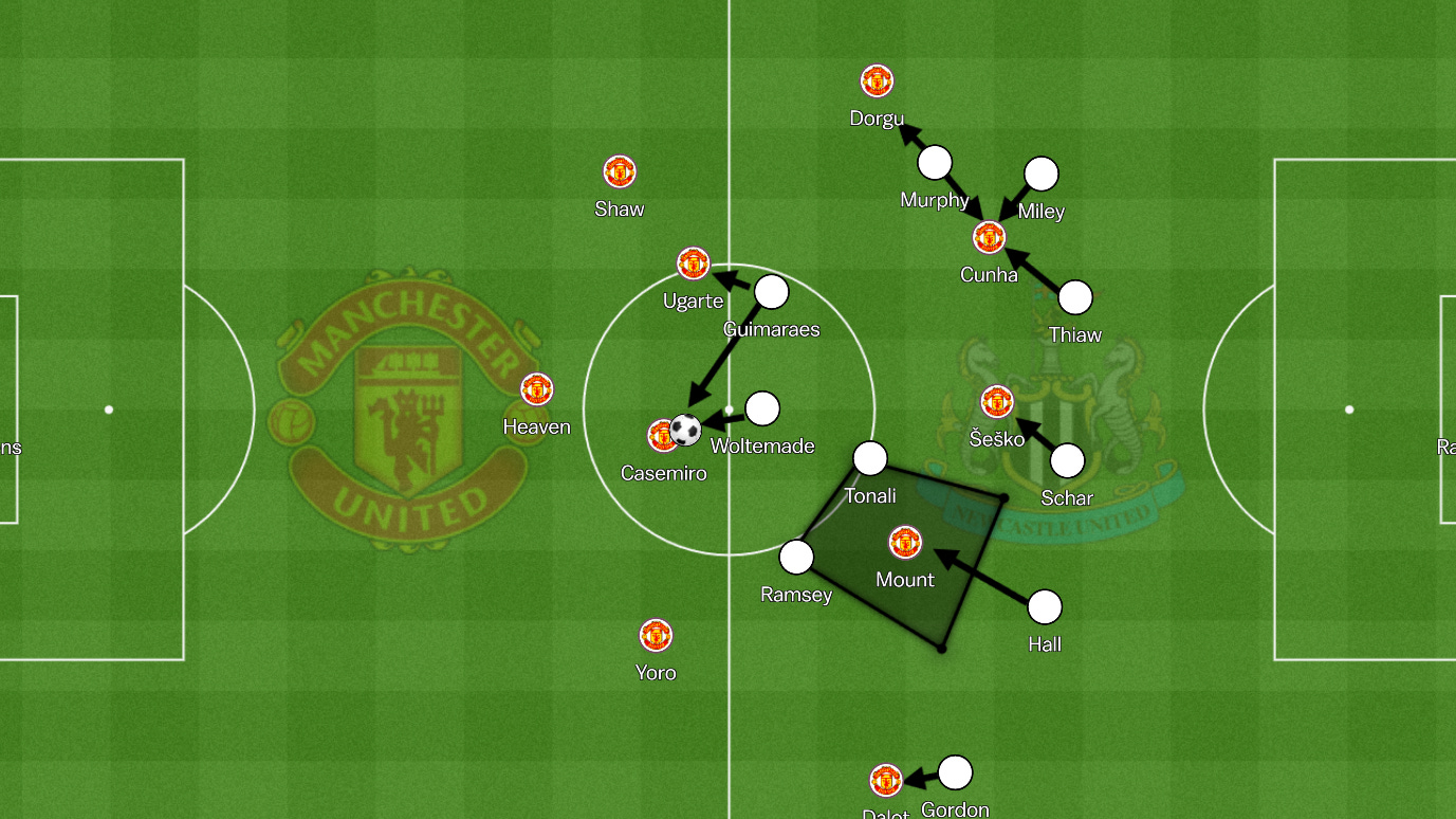 Tonali and Jacob Ramsey will likely prioritise limiting United’s access to Mount when the Magpies are out of possession, while Lewis Miley and Malick Thiaw will double up on Matheus Cunha, with Jacob Murphy playing a hybrid role between Cunha and Patrick Dorgu.