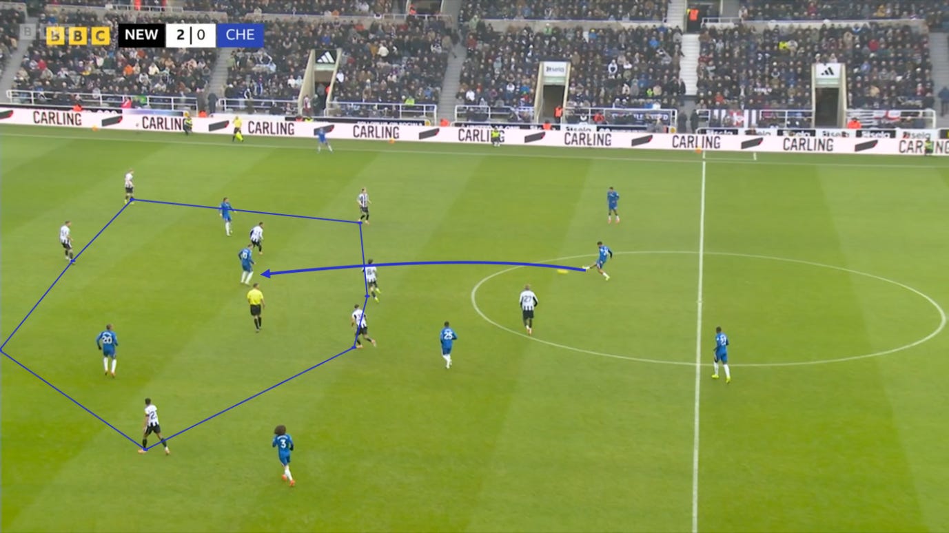 Each of those factors were central to the way that Chelsea fought back against Newcastle last weekend. Initially starting with Malo Gusto at right-back and James and Caicedo in midfield, Maresca’s side struggled to penetrate Newcastle’s midblock in the first half.