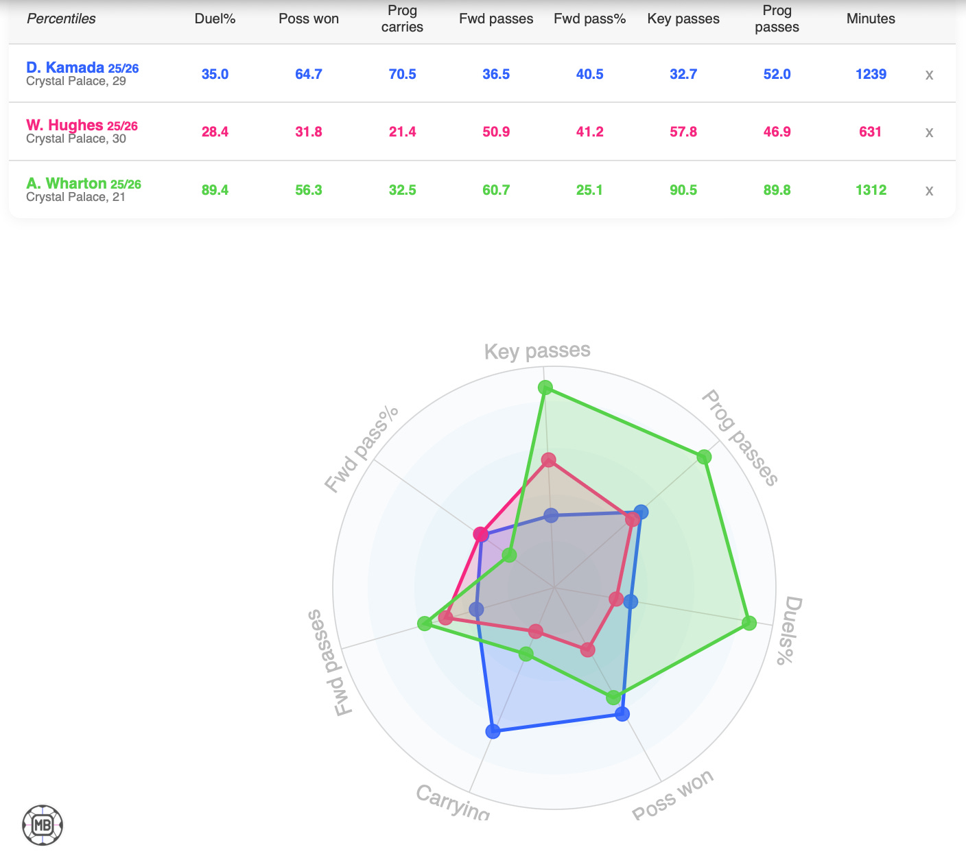Evident here, we can see that Wharton and Kamada, the favoured double pivot, compliment each other. Wharton excels at duels, progressive passes, and key passes. Alternatively, Kamada is especially gifted at winning possession and carrying the ball.