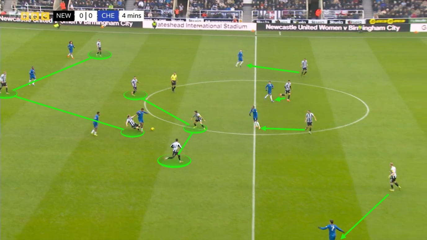 In the first half against Chelsea last weekend, the Magpies tried to employ a player-to-player press all over the pitch. They left their defenders exposed one vs one in the hope that their midfield overload would strangle the Blues into giving away high turnovers. The image below is the turnover leading up to Nick Woltemade’s opening goal.