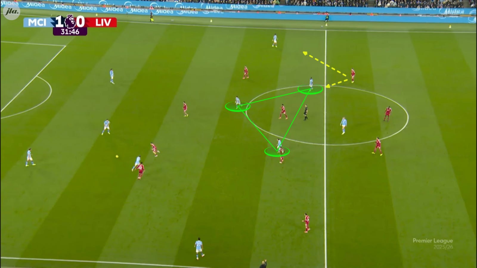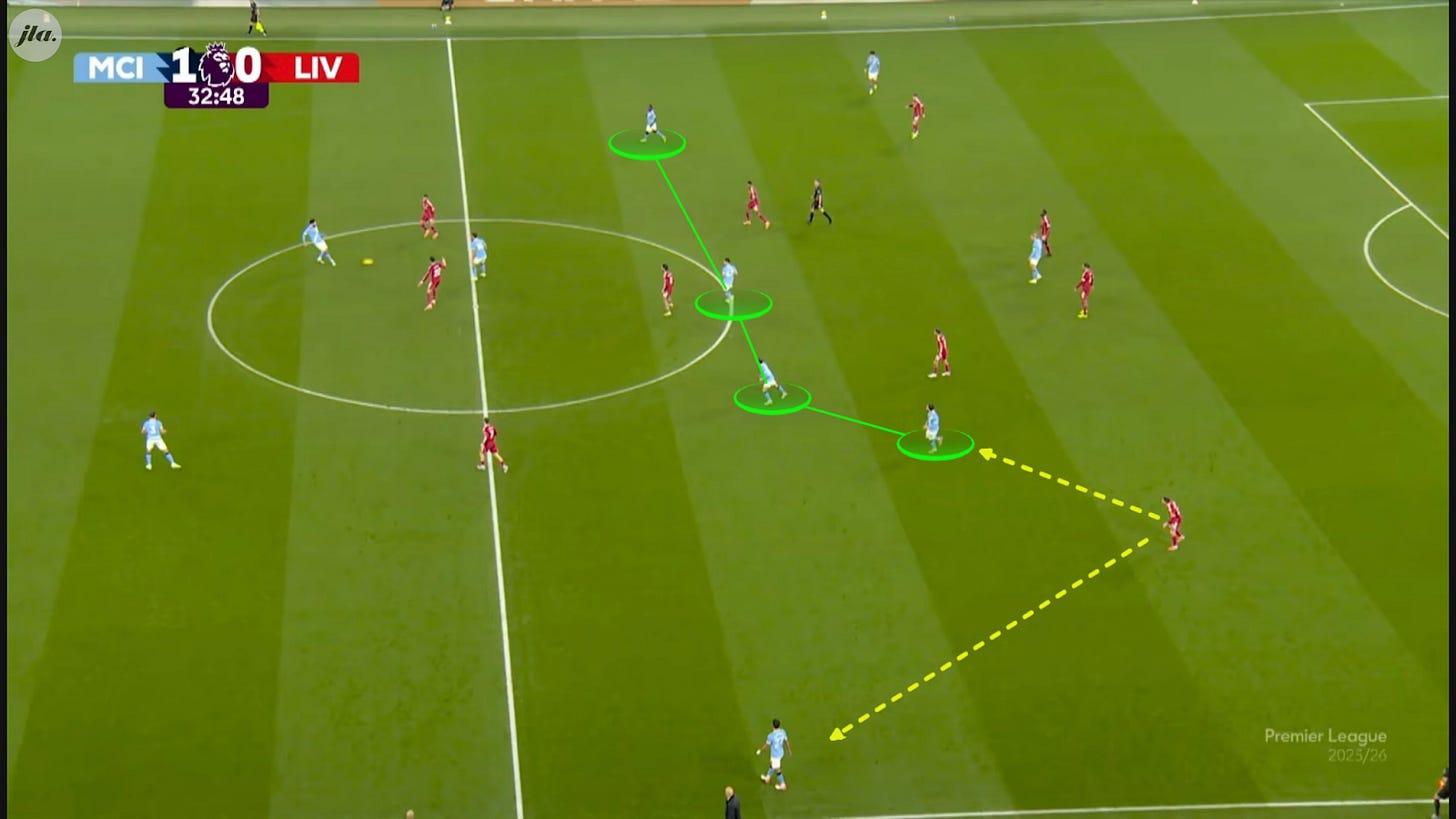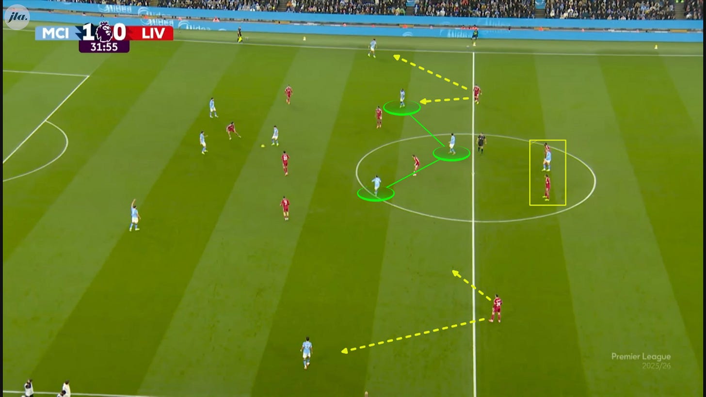The positioning of Manchester City’s wingers and fullbacks make it difficult for the opposition fullbacks who are often caught with dual marking responsibilities. This was seen against Liverpool as both Conor Bradley and Andy Robertson struggled to apply pressure when City’s wingers received the ball between the lines, due to the positioning of the fullbacks.