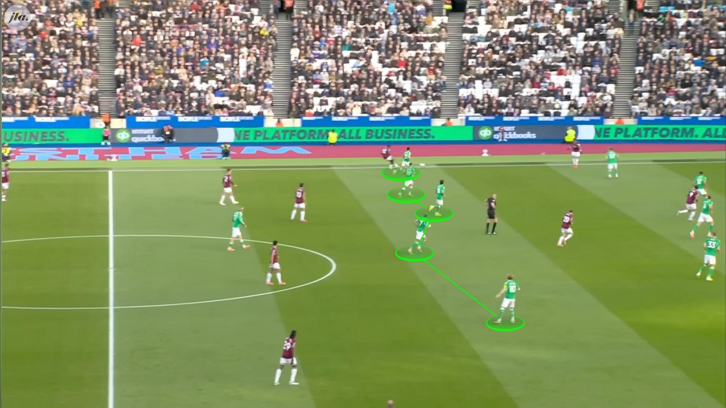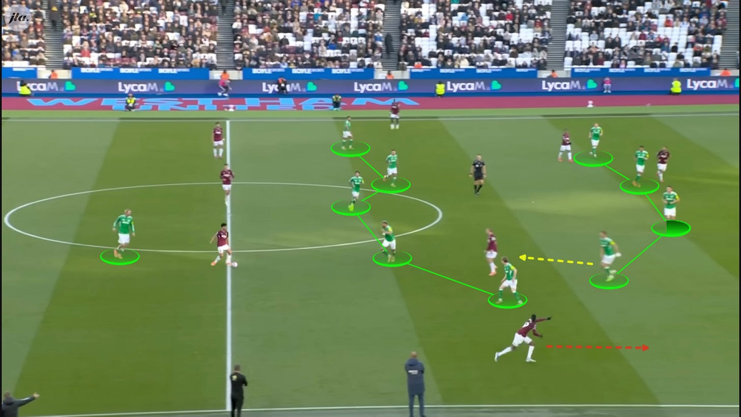 This example from the West Ham game shows a similar pattern which could occur against Manchester City, as Jarrod Bowen has taken up a position behind the Newcastle line of five, forcing Burn to follow him infield and therefore leave space for Aaron Wan-Bissaka to run into.