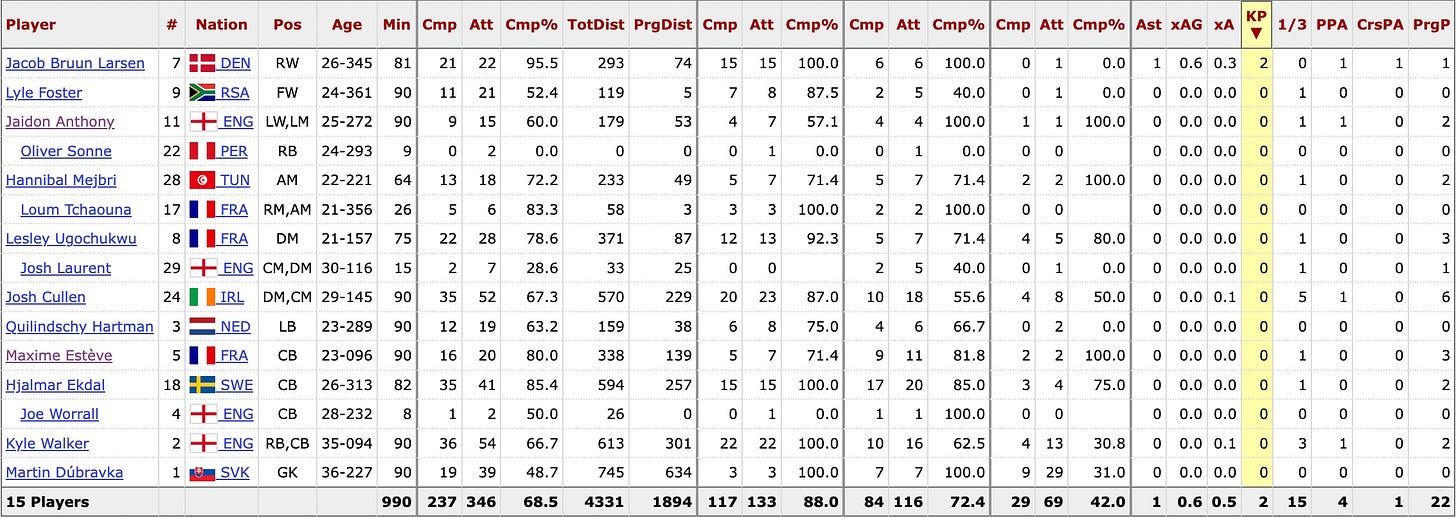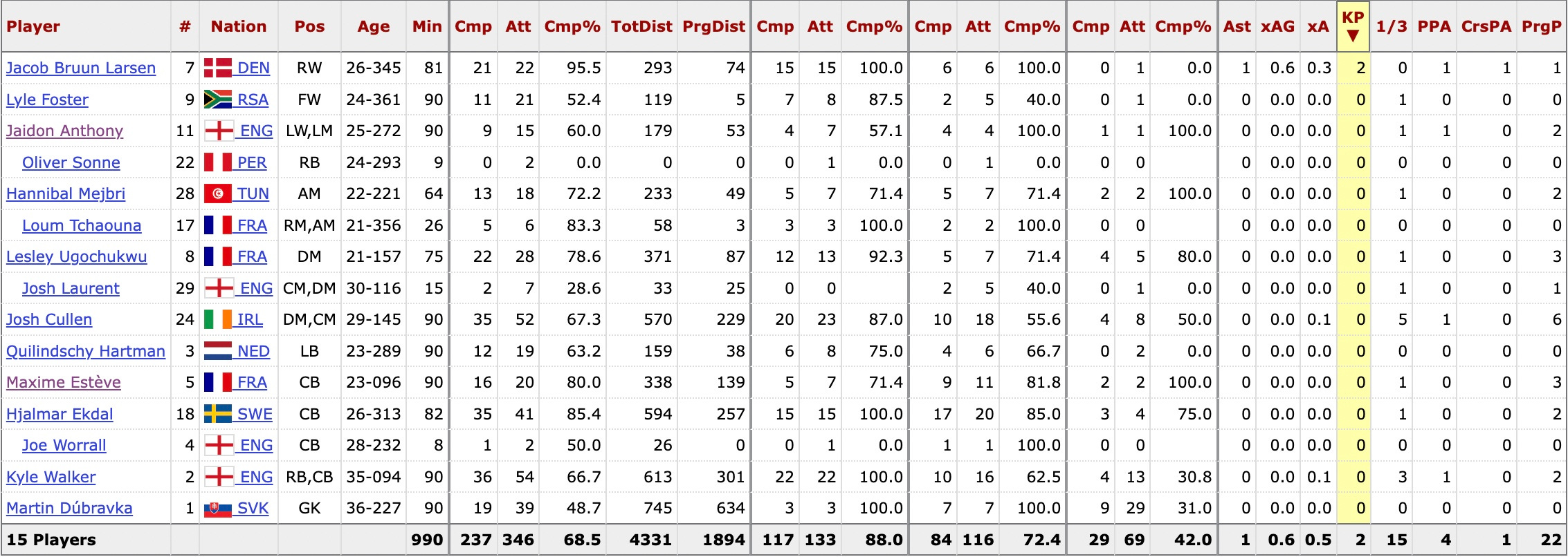 United had two players who completed more than five key passes, while for Burnley, only one player managed to register even a single key pass. This comparison highlighted the difference in individual quality: United, even if inconsistent, possessed players capable of decisive actions.