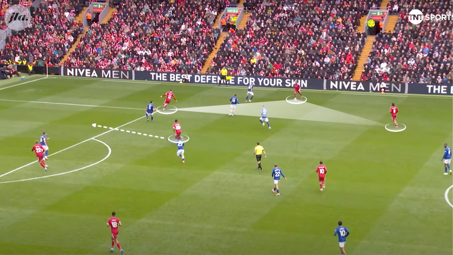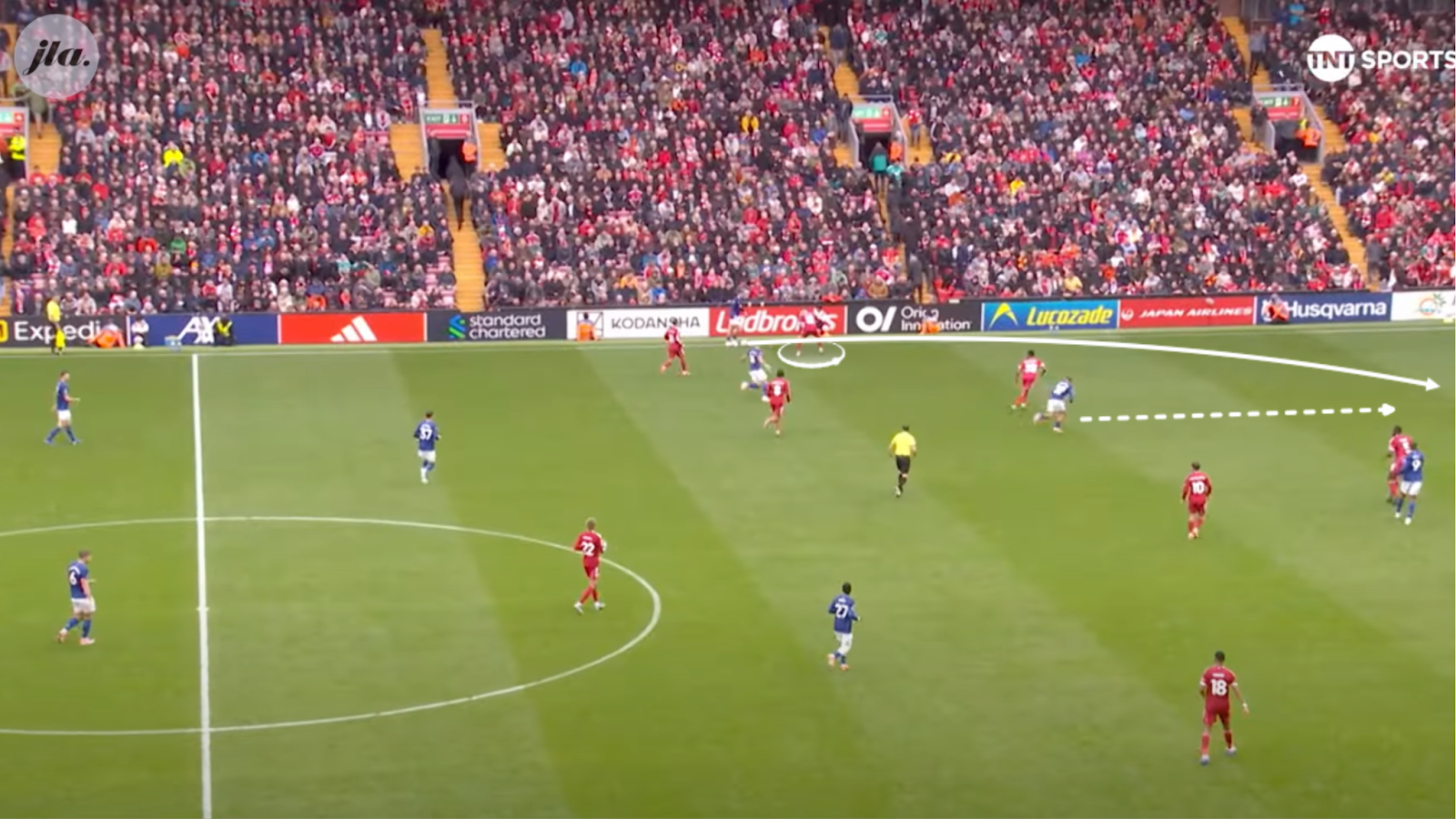 Everton took advantage of this, with both Vitaliy Mykolenko and Jack Grealish coming deeper out wide, dragging Gravenberch across and leaving Bradley man to man with Grealish and freeing Kiernan Dewsbury-Hall to make the run in behind to cut it back, which was the Blues’ main way of creating chances in the first half.