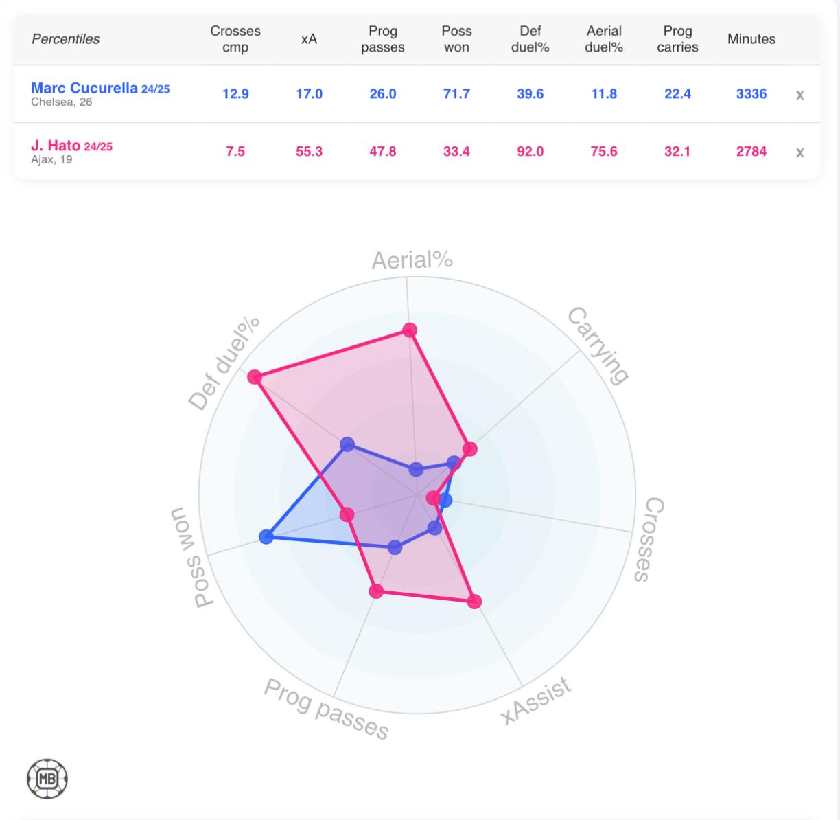 As you can see in the above graph, Hato and Cucurella aren’t too dissimilar in the way in which they perform in some of the key attributes for fullbacks. These similarities can also underline the role in which they both play. Cucurella is a very aggressive defender in the way in which he steps up hence the amount of times he wins possession as opposed to Jorrel Hato who wins duels, which can perhaps point towards the difference in stature between the 2 players.
