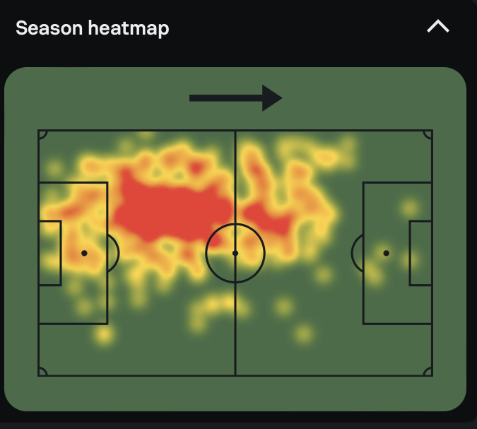 These numbers are by no means extraordinary but they do show that he can be a threat from deep for his side. He is also a very good 1v1 defender because of his speed and generally good reading of the game, this leads him to tackling 76.7% of dribblers that take him on per 90. He is by no means perfect - he’s 19, he is extremely one-footed, rarely opting to use his right foot even in situations where perhaps it’d be more beneficial to do so. This isn’t the best trait however, it can be and is often hidden by the fact he operates mostly in the left half space so he very rarely needs to use his right foot when it comes to progressing the ball.
